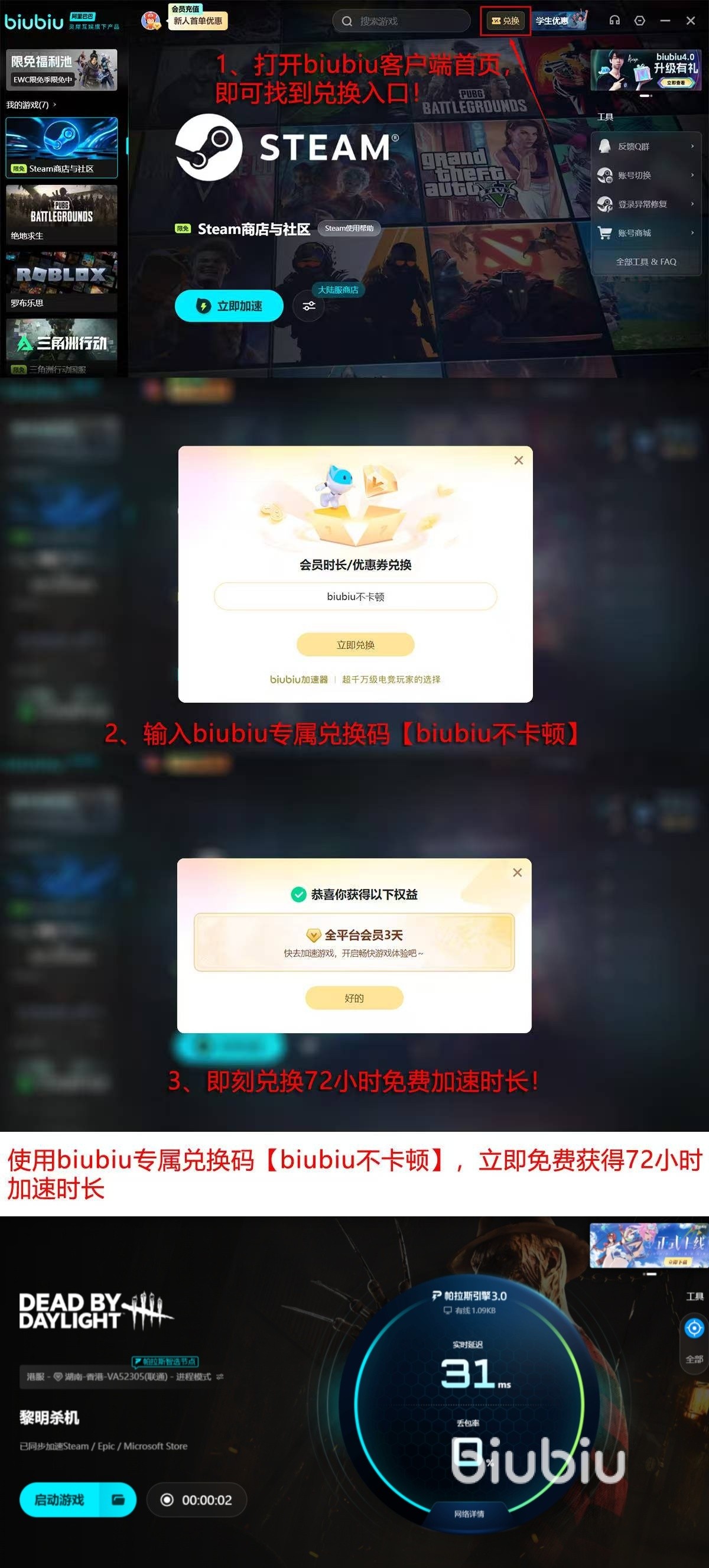 目前新用户注册即可领取24小时全游戏免费加速时长;另输入专属兑换码【biubiu不卡顿】,还可额外获得72小时加速服务,总计96小时,覆盖完整新手适应期与多轮实战测试周期,充分验证网络优化实效。