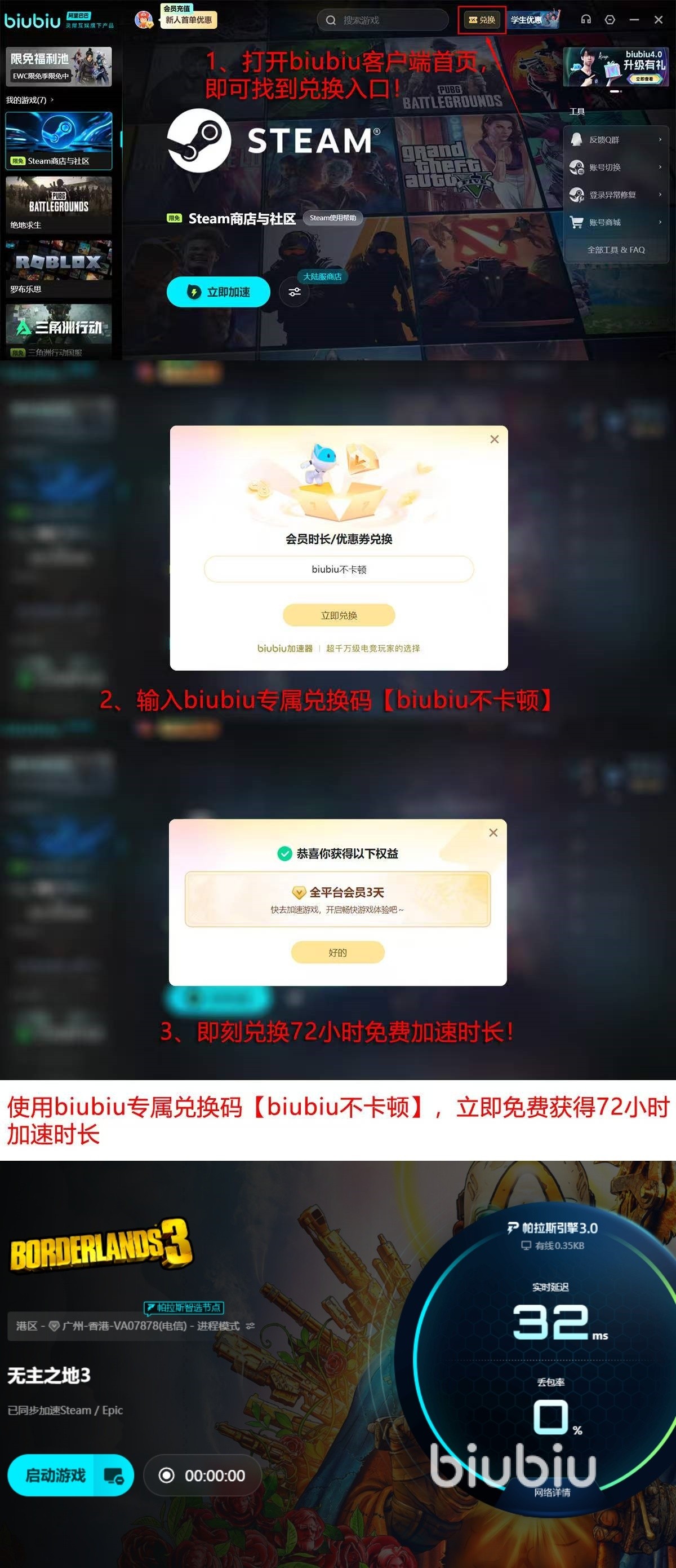 面向新用户,biubiu当前开放24小时全功能免费试用权限。若需延长使用周期,可在激活界面输入兑换码【biubiu不卡顿】,即可额外获得连续72小时加速服务权益。