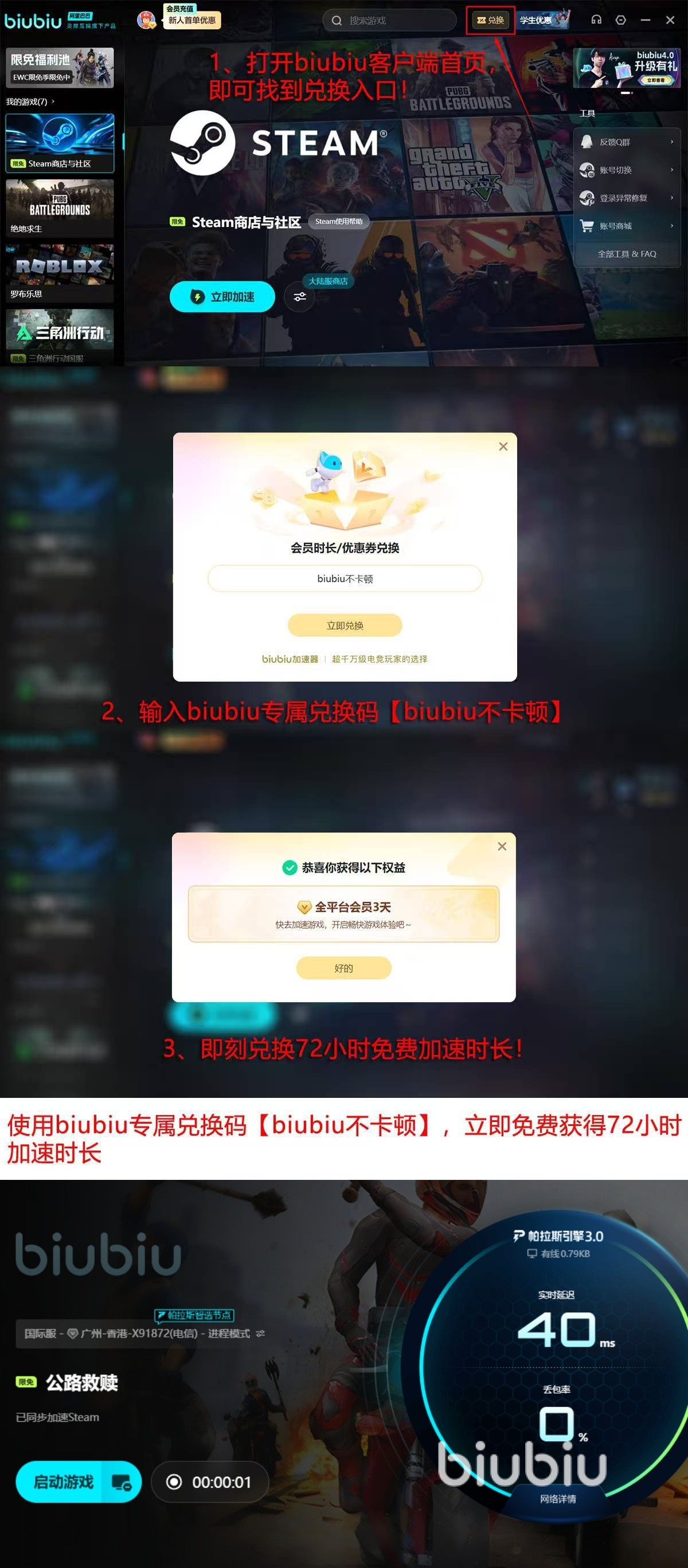 目前biubiu还推出了两项重磅福利,第一项是新注册的账号,可以直接获得24小时加速时长,方便新手体验感受,第二项是每一个账号,都可以使用一次【biubiu不卡顿】的兑换码,这样能获得72小时免费时长,也就是说新人可以一次性拿到96小时。