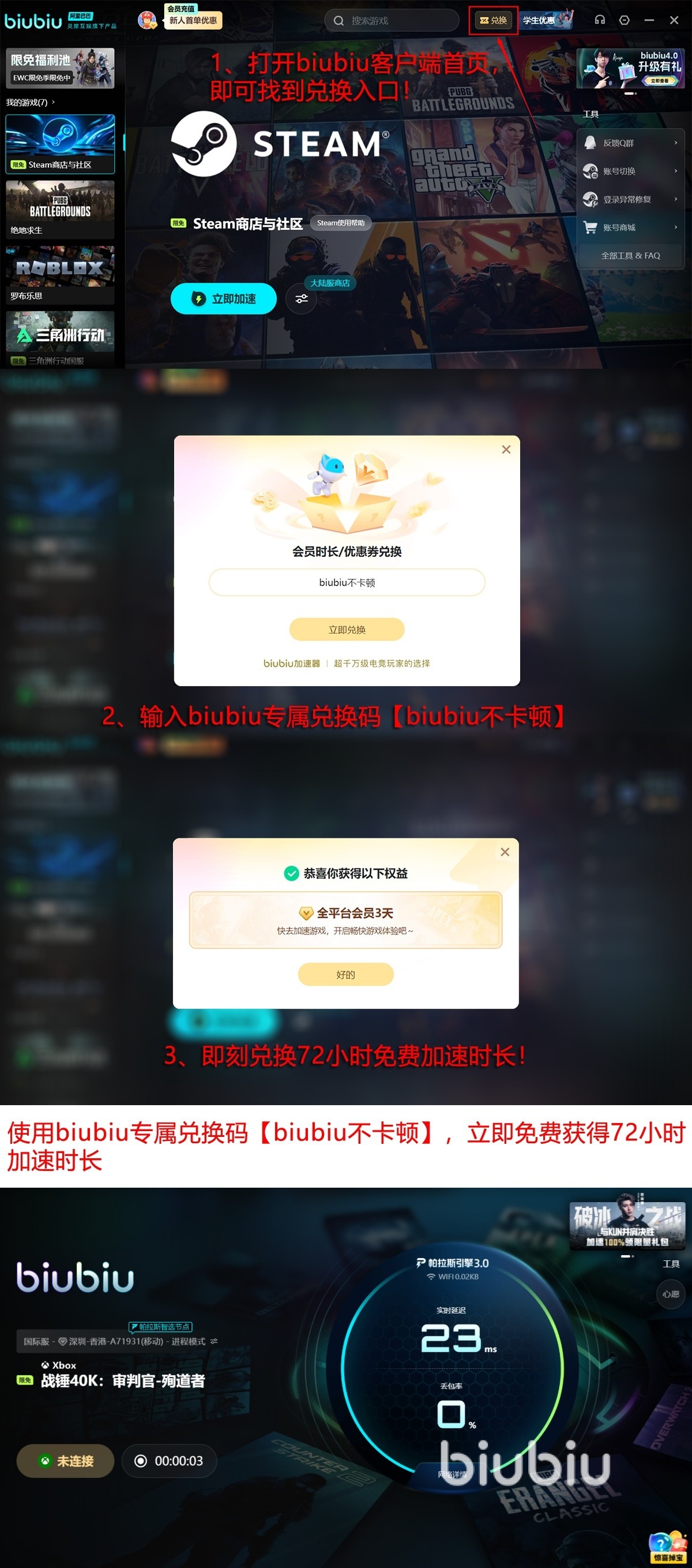 新用户注册biubiu账号即可获赠24小时免费加速时长,适用于紧急排障与性能验证。若需延长体验周期,所有用户(含老用户)在激活加速服务时输入口令【biubiu不卡顿】,可额外获得72小时加速权益。叠加后总时长达96小时,足以完整通关一次主线+两个大型DLC战役。从泰拉轨道空降,到卡利班废土决战,稳定低延迟连接,让每一次灵能爆发与处决动画都丝滑如初。