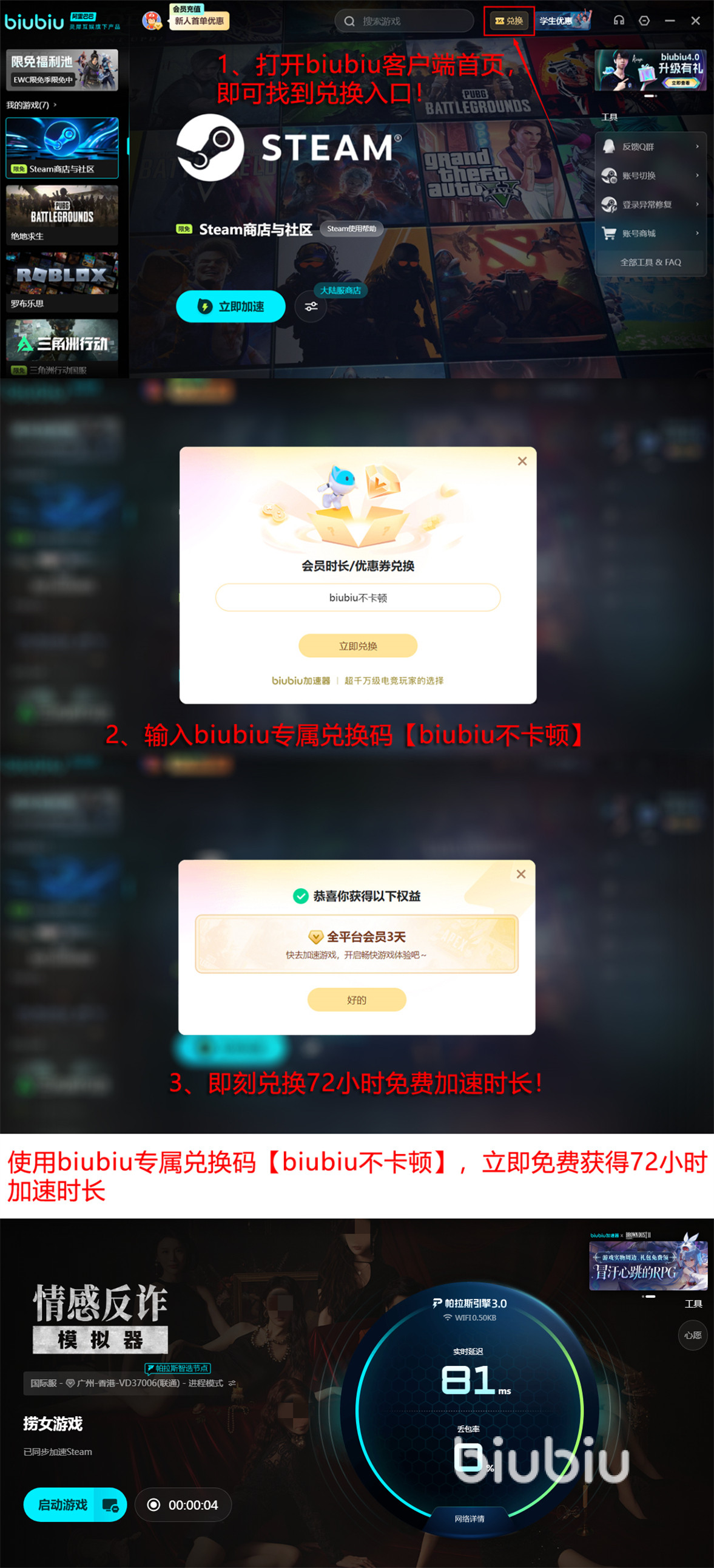 在福利方面,biubiu也领先于其他的软件,首先是对新注册账号直接送24小时加速时间,这样方便新人直接打开就能使用。还有一个兑换码【biubiu不卡顿】需要大家牢记,可以直接换取72小时加速时间,每个号都能换一次。这样新号两项福利都能享受到,总计96小时。