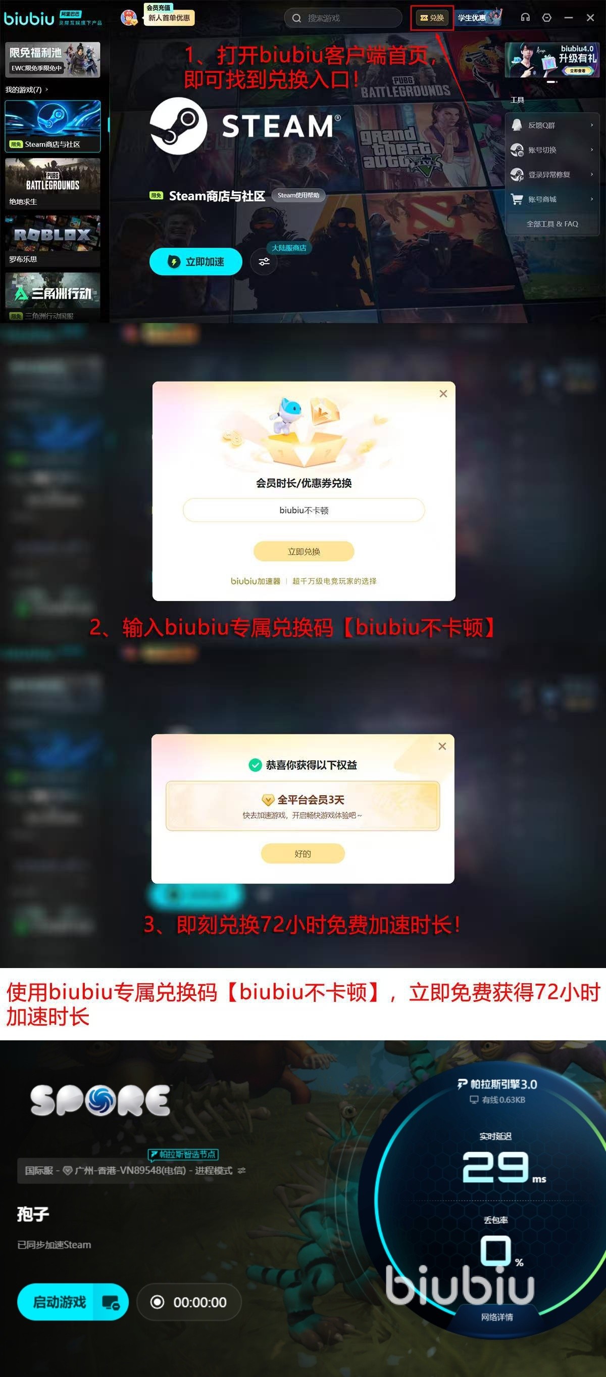关于使用成本,新用户无需付费即可体验完整服务:新人首次进行注册,可以直接拿到24小时的免费加速时间;进一步输入专属口令【biubiu不卡顿】,还可再获得72个小时的时长,即新用户总计享有96个小时的免费加速权益。