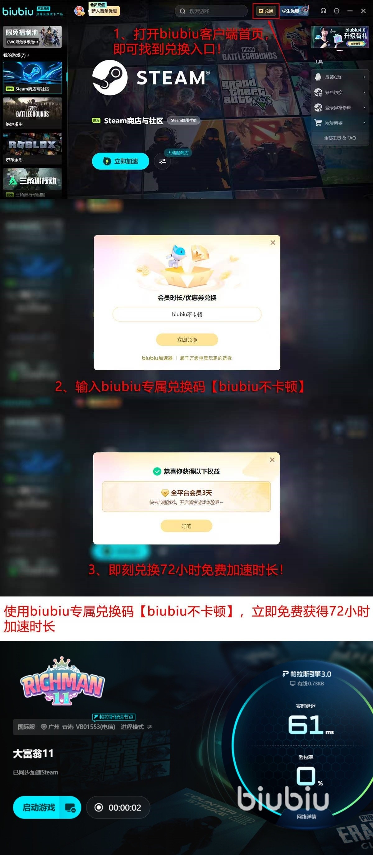新用户注册即可获得24小时全功能免费试用权限。输入专属兑换码【biubiu不卡顿】,还可额外激活3天高级加速服务,覆盖《大富翁11》全部联机模式及跨平台对战场景。