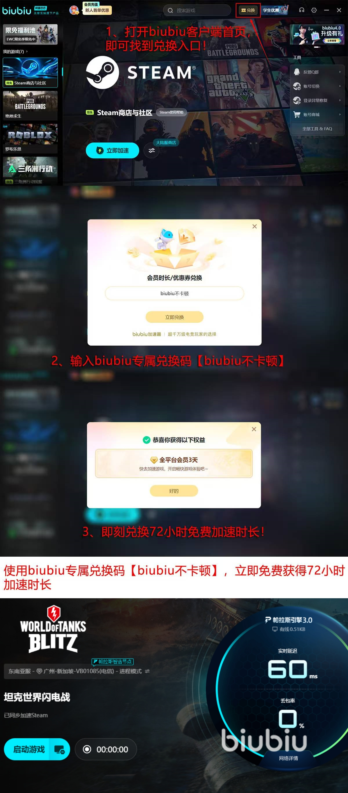 除性能优势外,biubiu加速器同步提供高价值新人激励政策:当前输入兑换码【biubiu不卡顿】,即可激活72小时全游戏通用加速时长;新注册用户额外获赠24小时专属加速权益,合计可享96小时免费体验期。该福利方案在同类工具中具备显著竞争力,兼顾实用性与入门友好度。