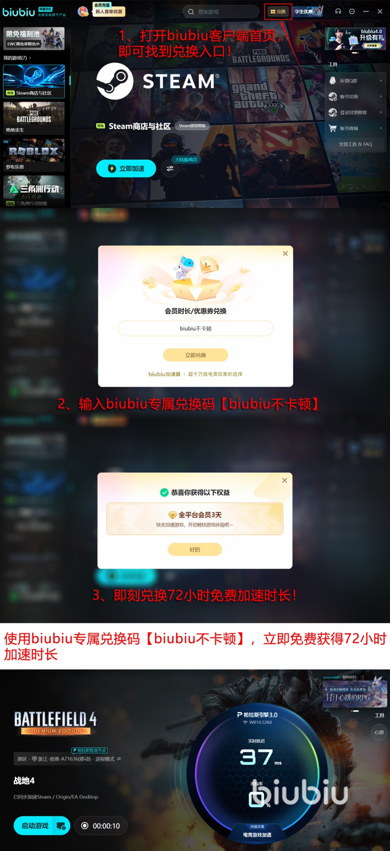 选择biubiu来加速的话,加速器上推出各项福利可不能错过。加速器针对新人用户有24h的免费加速福利,不管是刚刚注册的新用户还是已经注册过的老用户都可以使用【biubiu不卡顿】这个口令领到3天的加速时间。具体的领取流程可以见长图来了解。