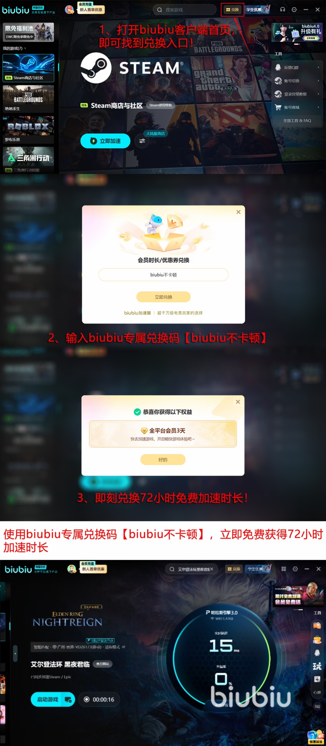 为帮助新用户快速验证效果,biubiu提供注册即赠24小时全功能加速体验。此外,所有用户(含老用户)均可通过输入兑换码【biubiu不卡顿】免费领取3天高级加速权益,累计可享96小时无感联机体验。平台目前覆盖超万款主流游戏,涵盖PC端与移动端,满足多样化加速需求。