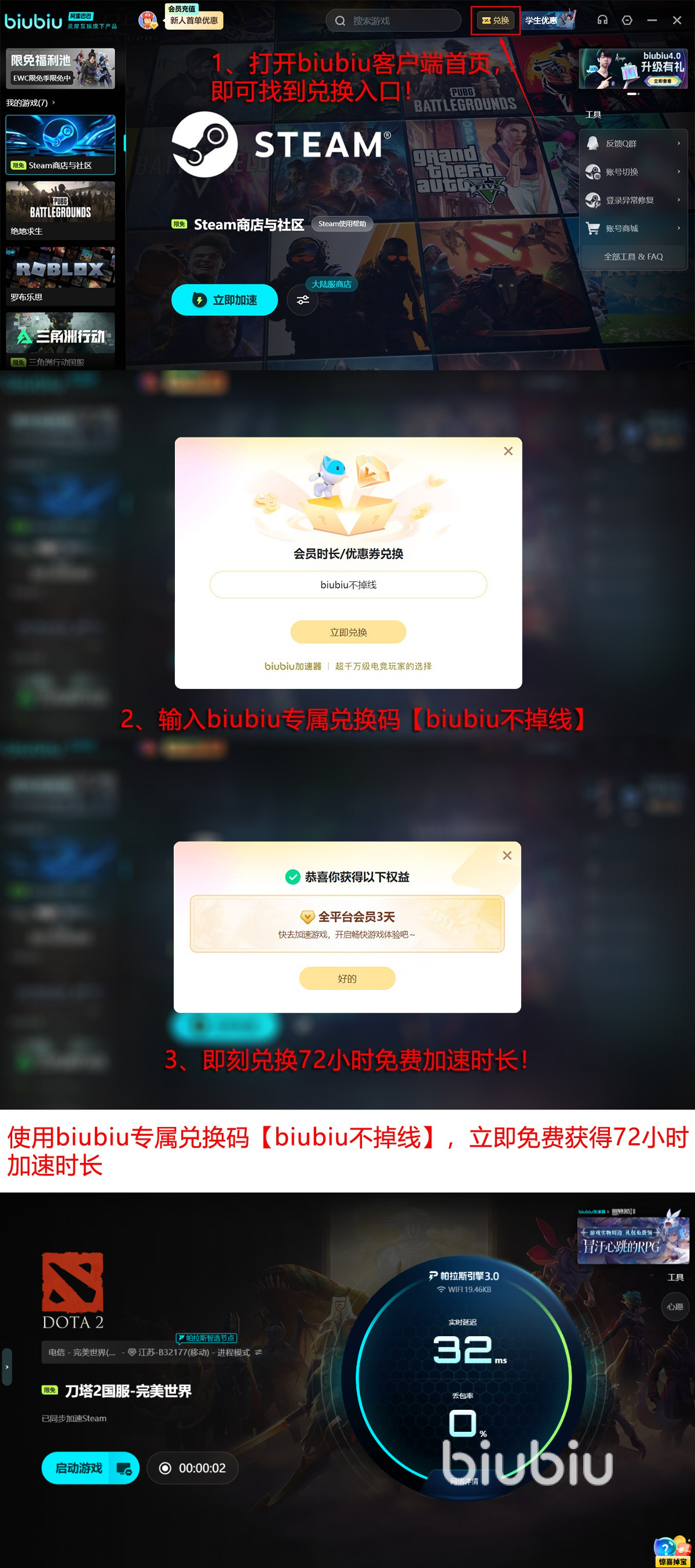 biubiu加速器为新玩家准备专属福利,加入后即刻获得首日24小时全功能免费体验,输入【biubiu不掉线】开启无阻竞技72小时,新用户叠加首日试用和口令福利,总计可获得4天全功能加速体验。