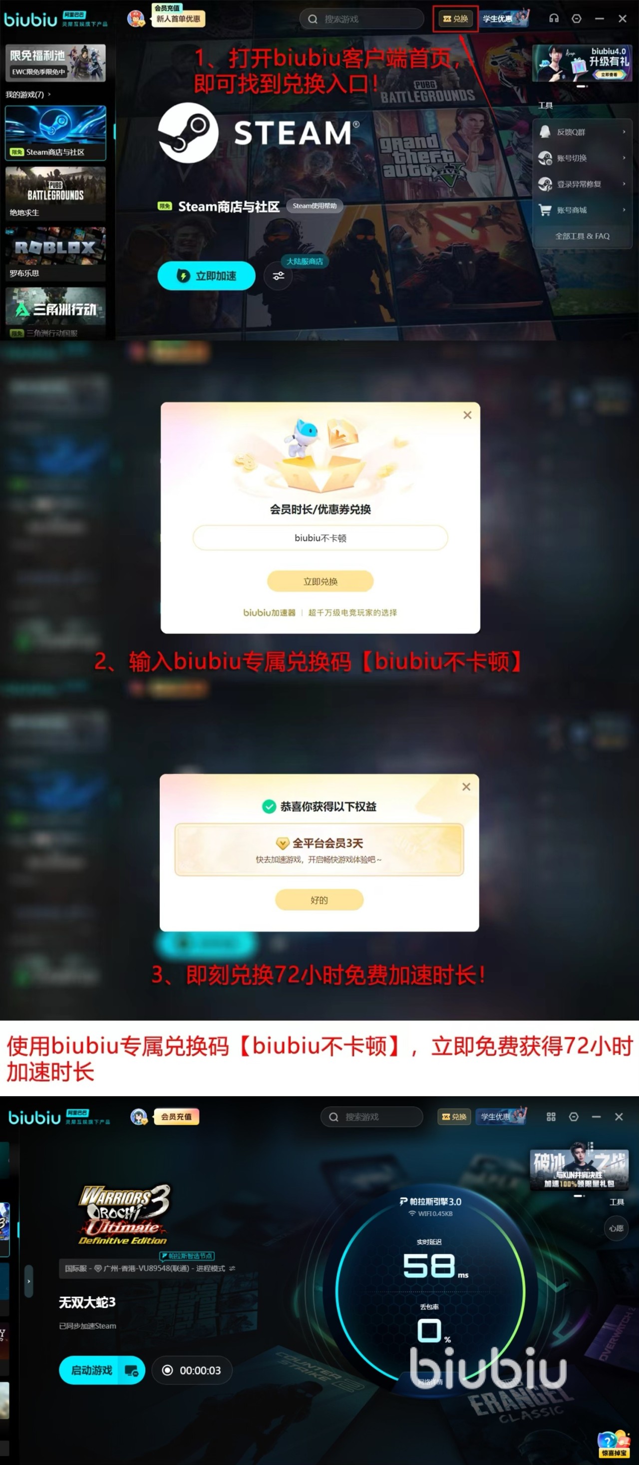 关于使用门槛与成本,biubiu加速器采用极简交互逻辑:安装后一键启动对应节点,无需手动配置端口或代理规则;新用户注册即赠24小时免费加速时长;另开放通用兑换码【biubiu不卡顿】,所有账号均可领取3天全功能使用权,零成本完成全流程体验验证。