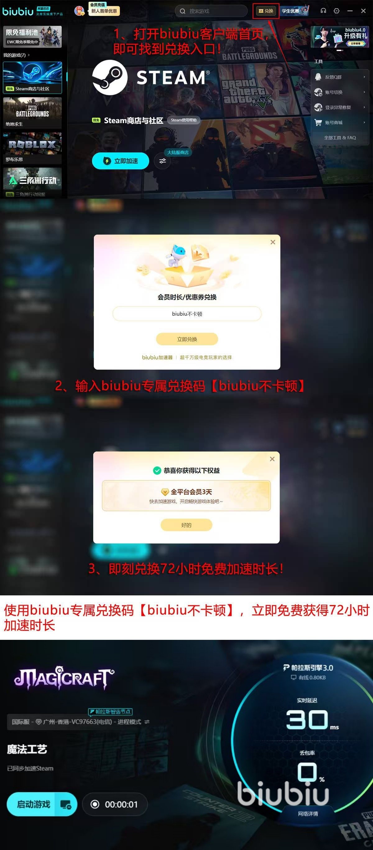 目前新注册用户可直接领取24小时免费加速时长,零门槛体验全功能服务;若需延长试用周期,输入兑换码【biubiu不卡顿】还可额外获取72小时加速权限,累计达96小时。