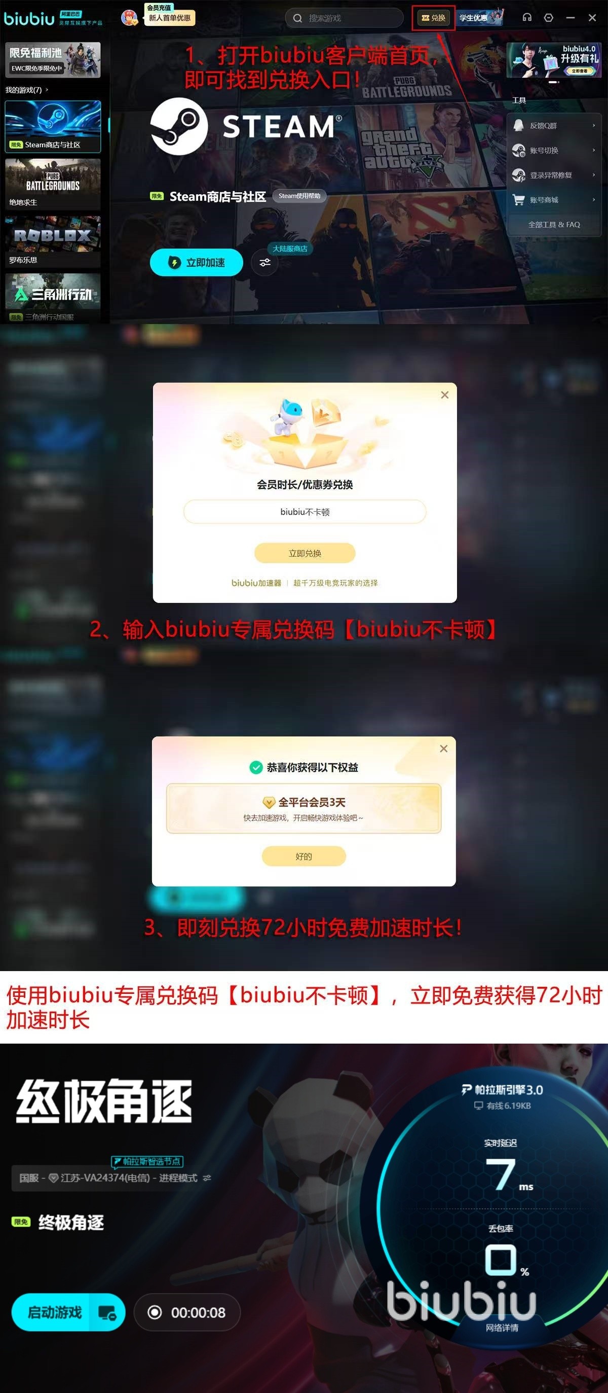 新用户注册后,可立即获得24小时全游戏加速权益;在主界面输入兑换口令“biubiu不卡顿”,还可额外领取72小时会员时长。两项福利叠加,总计可享96小时无限制加速服务,覆盖《终极角逐》全部玩法模式。