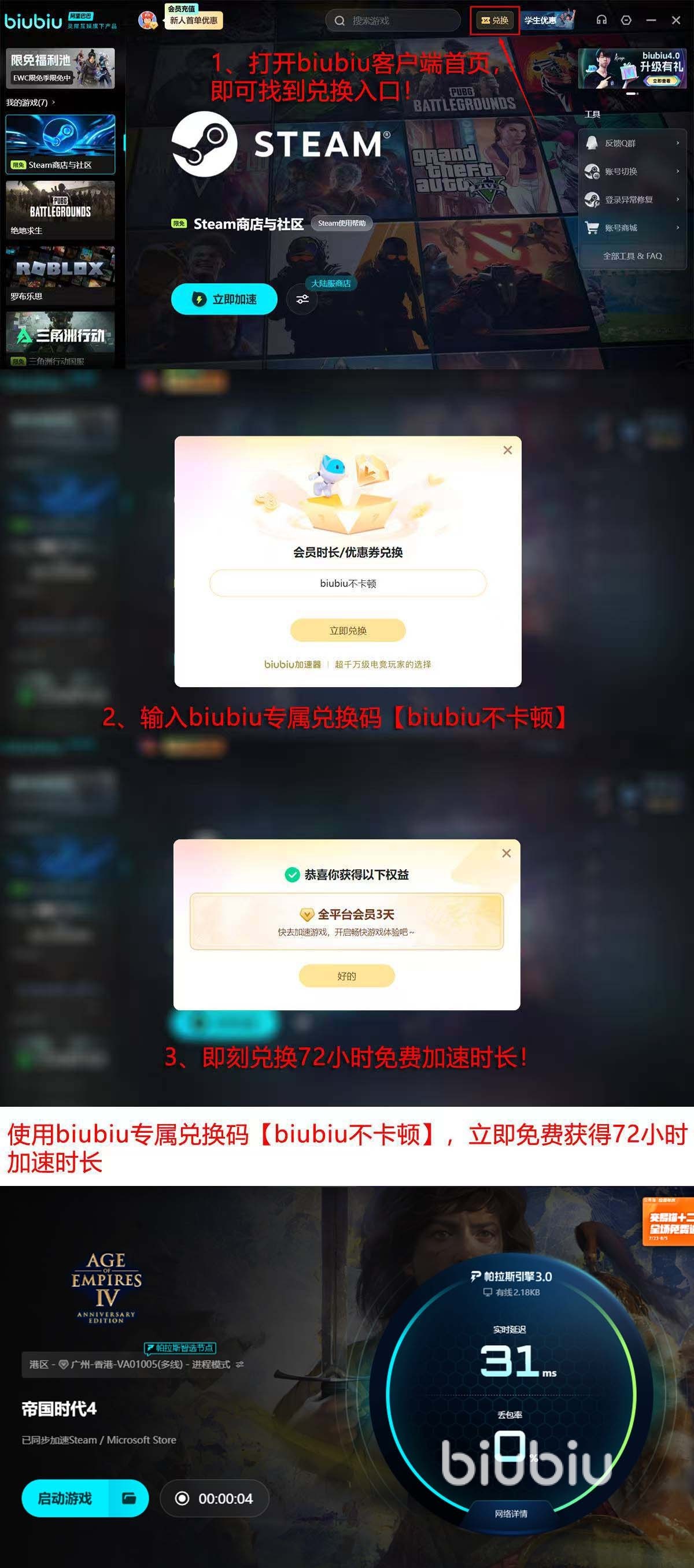 作为即时战略游戏,帝国时代4在联机时再得到网络的支持后,其所带来的体验将是绝无仅有的。大家喜欢的话,可以现领取免费时间体验几天,现在有2个福利可以领,一个是注册新手账号是,系统自动附送的24小时福利,成为会员后打开首页上的“兑换”,把口令【biubiu不卡顿】填写或者粘贴其中,就能再拿到72小时,一个账号目前能拿到96小时。