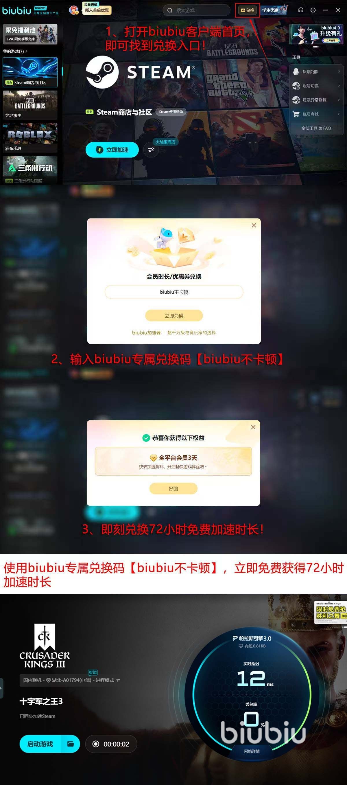 当然,对于角色扮演的十字军之王3玩家来说,biubiu所带来的最大改善还是改善了国际服网络,让游戏的运行更平稳,正在玩的玩家想要体验,可以先领取免费时间,安装完注册后会先领取到系统送的24小时,然后点击首页上的“兑换”,填写或者粘贴上兑换口令【biubiu不卡顿】,就能再得到72小时,所有免费时间累计会有96小时。