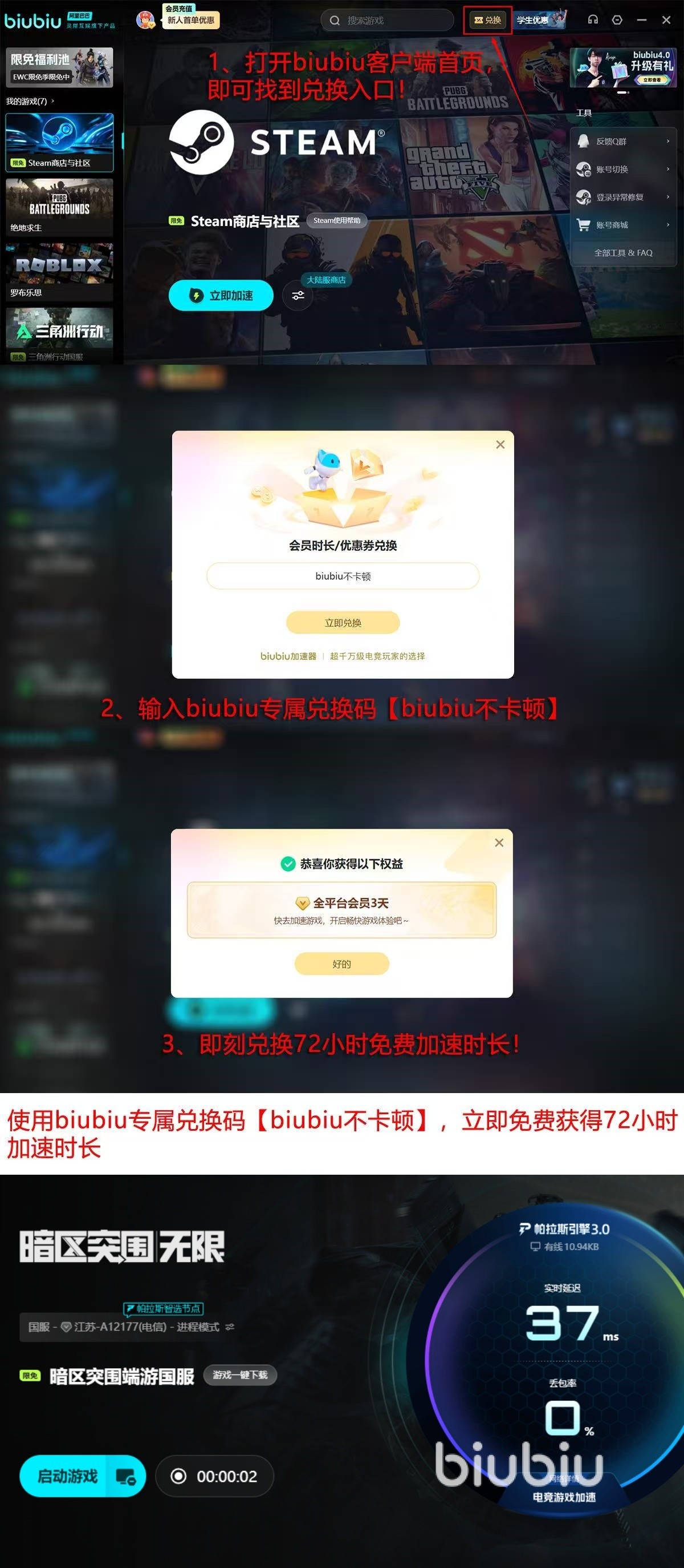 现在新用户在第一次进入游戏的时候可以获取到24小时的免费加速时间。大家如果觉得这个时间不是很够用的话,那么还可以使用兑换码【biubiu不卡顿】,这样还能够获取到3天的额外加速时间。