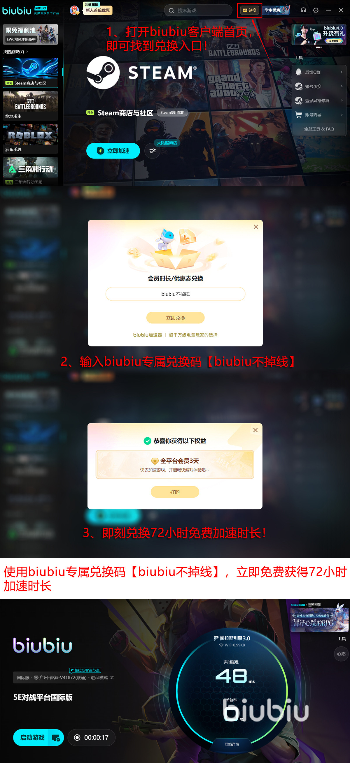 现在还有个用暗号 【biubiu不掉线】 就能免费拿3天的福利,如果你是头一回注册成功会额外再送你24小时。两边一加总共能白玩96个小时。