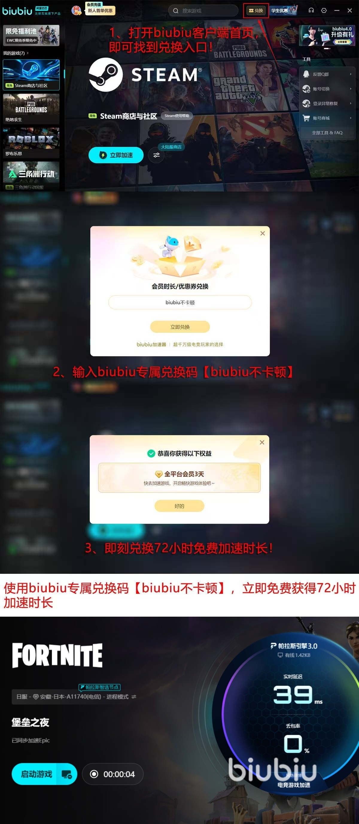 现在biubiu还推出新人0门槛体验活动,只要是全新注册用户,即可得到系统发放24小时加速时长,体验时间还能通过“biubiu不卡顿”兑换码延长72小时,累积之下直接无条件获取4天加速时间。