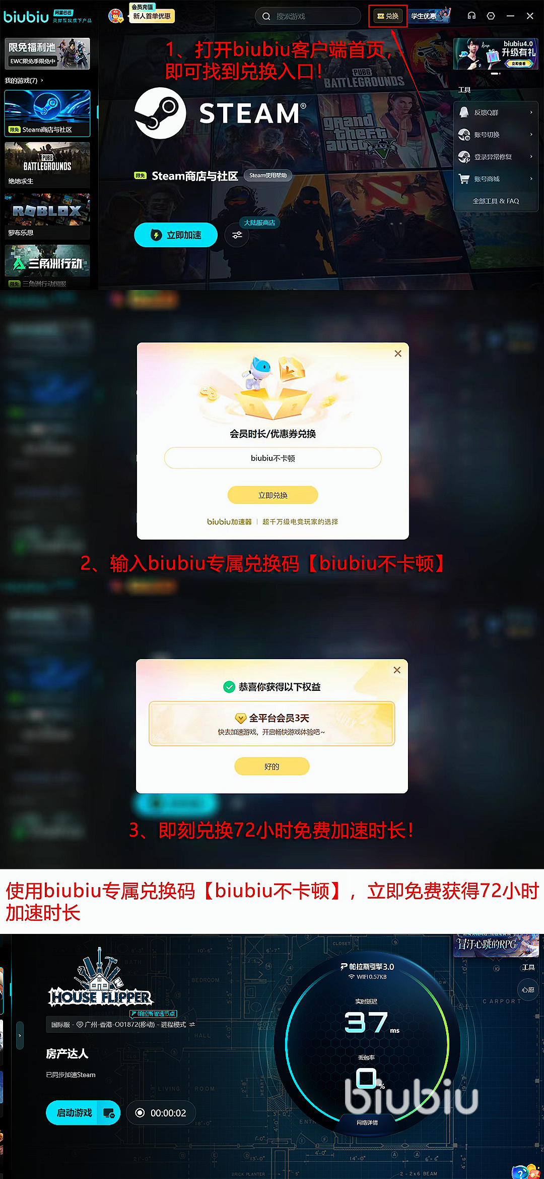 biubiu经过多年的性能升级,其口碑得到了广大网友的认证,同时为了反馈所有的用户,平台专门准备了丰富的福利,新用户注册即可领24小时全场游戏免费加速,所有用户输入兑换码【biubiu不卡顿】还能额外再领3天,新用户叠加两项福利累计可享96小时免费加速。