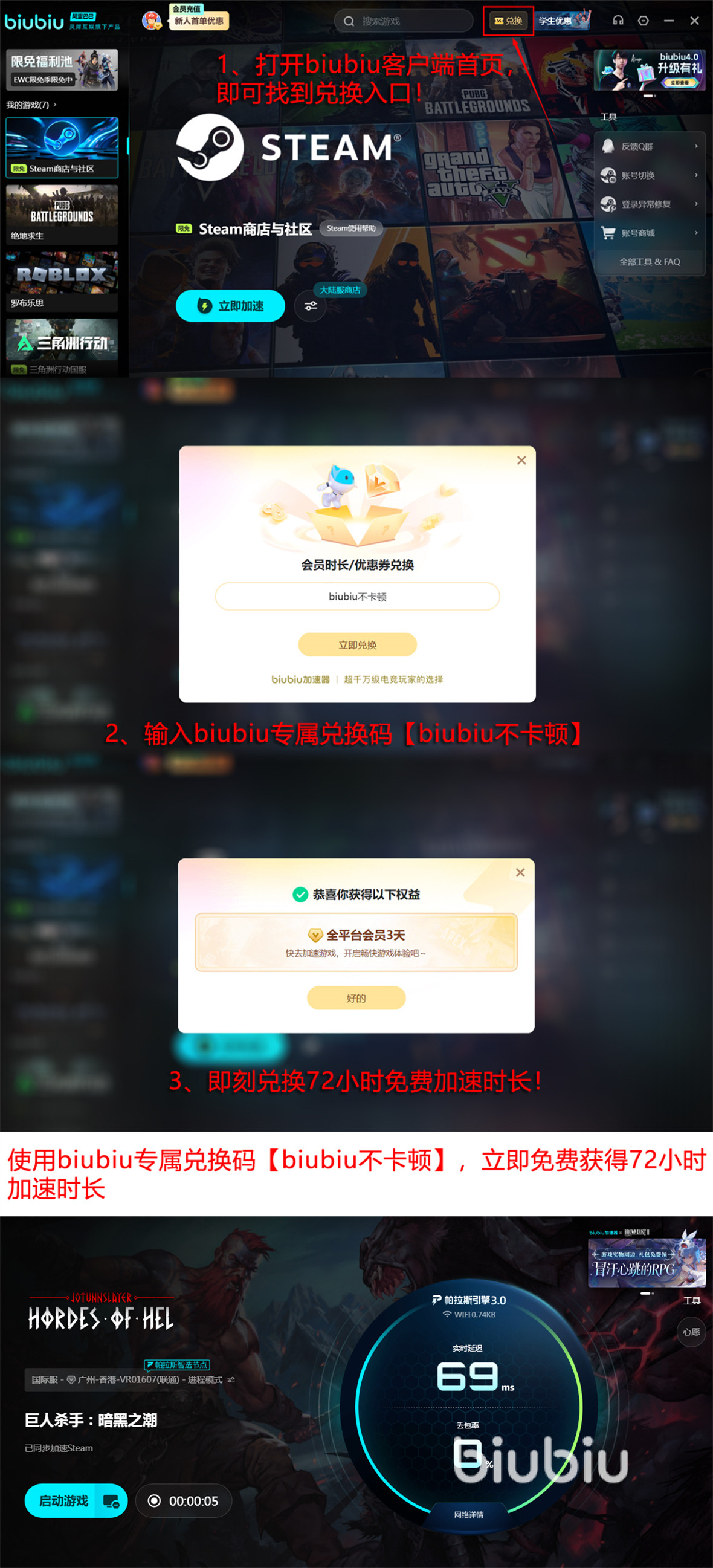 在实际操作中,biubiu采用的是会员加速模式,需要成为会员后才可以享受到稳定的加速服务。不过充值之前需要先了解两项重磅福利,第一项是新注册号能免费加送24小时,每个新号都是如此。还有一项是通过输入兑换码【biubiu不卡顿】,能够获得72小时加速时间。兑换码不仅仅是新号,老号也可以使用。