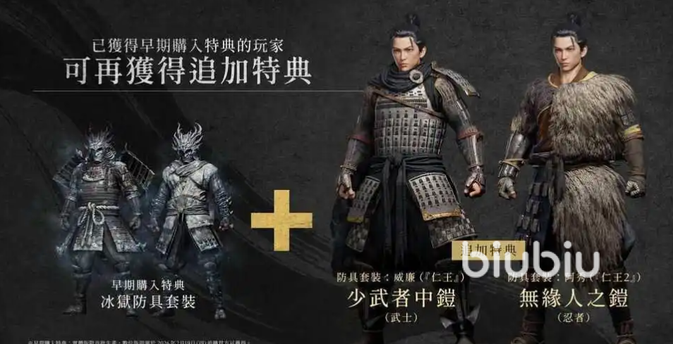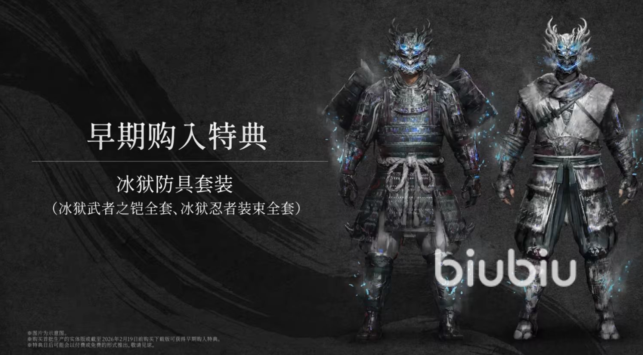 冰狱防具套装(武士/忍者)2件提高生存(体力+80,被攻击减伤-3%),3件提高水属性(水属性伤害+12%,异常抗性+25%),5件适应重攻击打法(强攻击伤害+10%,精力恢复+18%),2026年2月19日前购买。