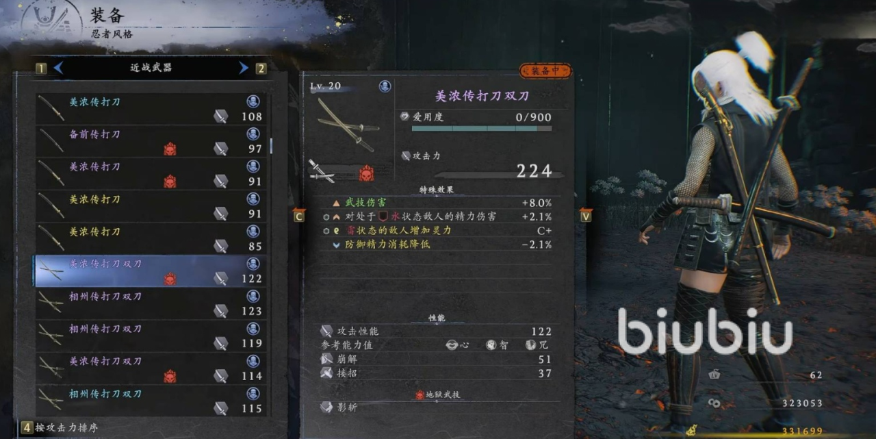 生存心和刚,心保证足够的精力进行高机动闪避和连续攻击,刚只需要根据你选择的轻甲或中甲装备需求投入,保证重量达标即可。忍者双刀的精髓就是快速叠加异常状态来触发混沌。用忍术或者魂技上异常,迅速减少敌人的精力。敌人被混沌或者空精之后,立刻切换成武士形态,用水形剑进行爆发输出。