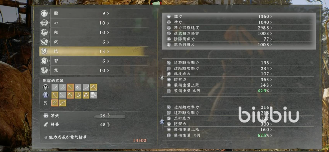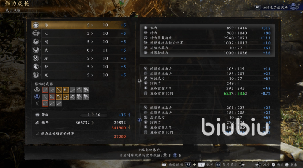 刚属性打底,前期投入15到20点刚,主要目的就是把装备总重量控制在70%以下,得到敏捷度B的评价。这时角色消耗的精力大大降低,闪避距离更远、速度更快,极大提高了战斗的灵活性、容错率,是有效运用太刀招式的基础。