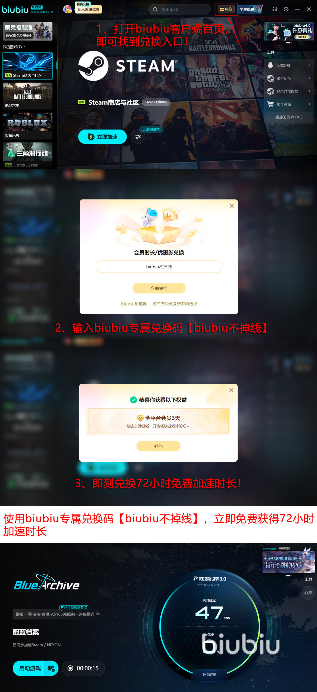 另外,新用户还可享受专属福利:输入激活码【biubiu不掉线】即可领取3天免费使用时长;首次注册用户还将额外获赠24小时,累计可达96小时无门槛体验。