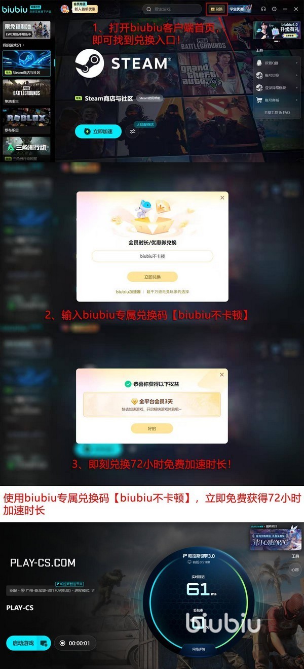 而在福利这一块,biu仔同样十分大气,不论是新老用户,都能够通过在客户端输入“biubiu不卡顿”口令来换取3天的全平台会员。与此同时,新用户在注册登录后也会自动领取24小时免费加速时长,这两者可以叠加使用,意味着对新人来说就是足足4天的体验时长了。