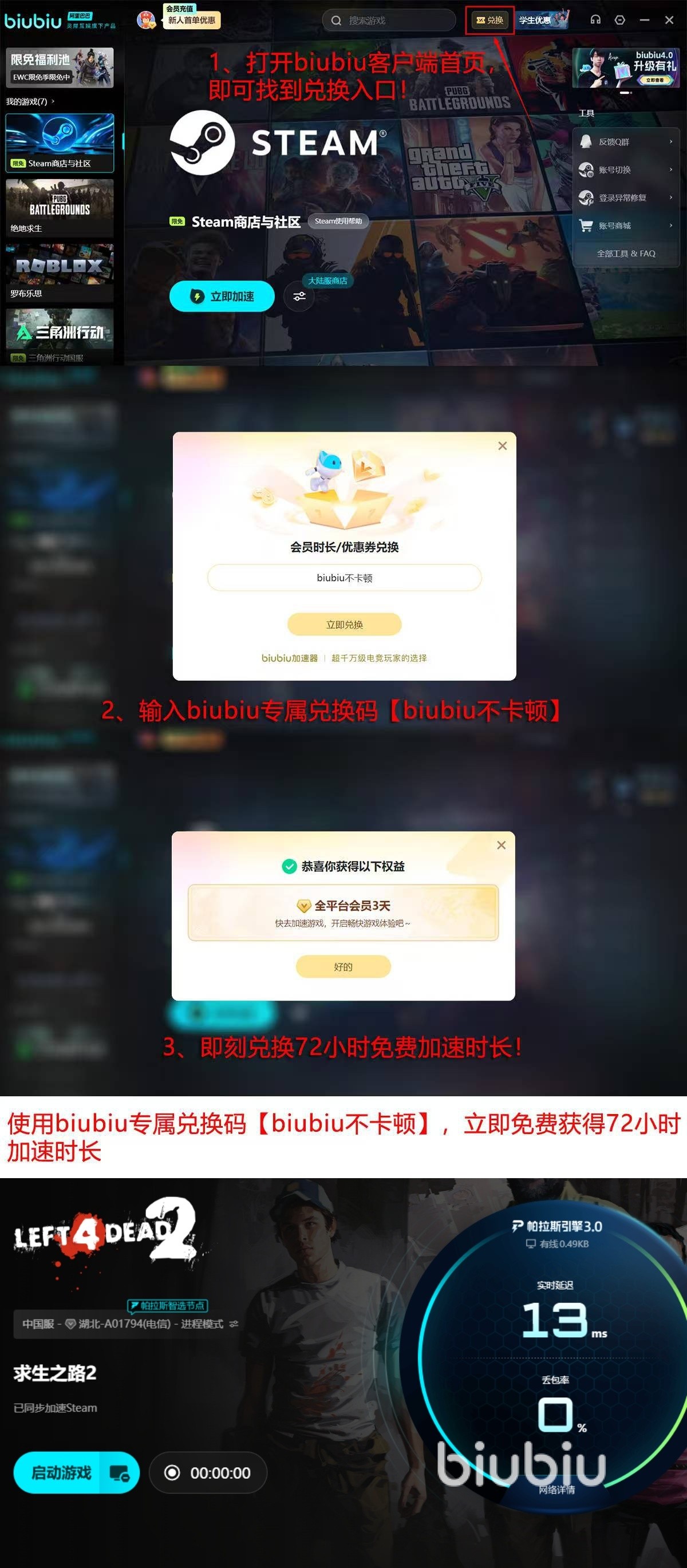 之前没有体验过的小伙伴们,也不用太担心,biubiu操作简单只需要搜索求生之路2后,就可以一键加速,而且现在新人只要注册,就会直接拿到24小时的免费加速时间,没有任何的附加要求,输入【biubiu不卡顿】这个兑换码,还能再拿到72小时,加起来足足有96小时,完全足够体验加速带来的顺畅效果。