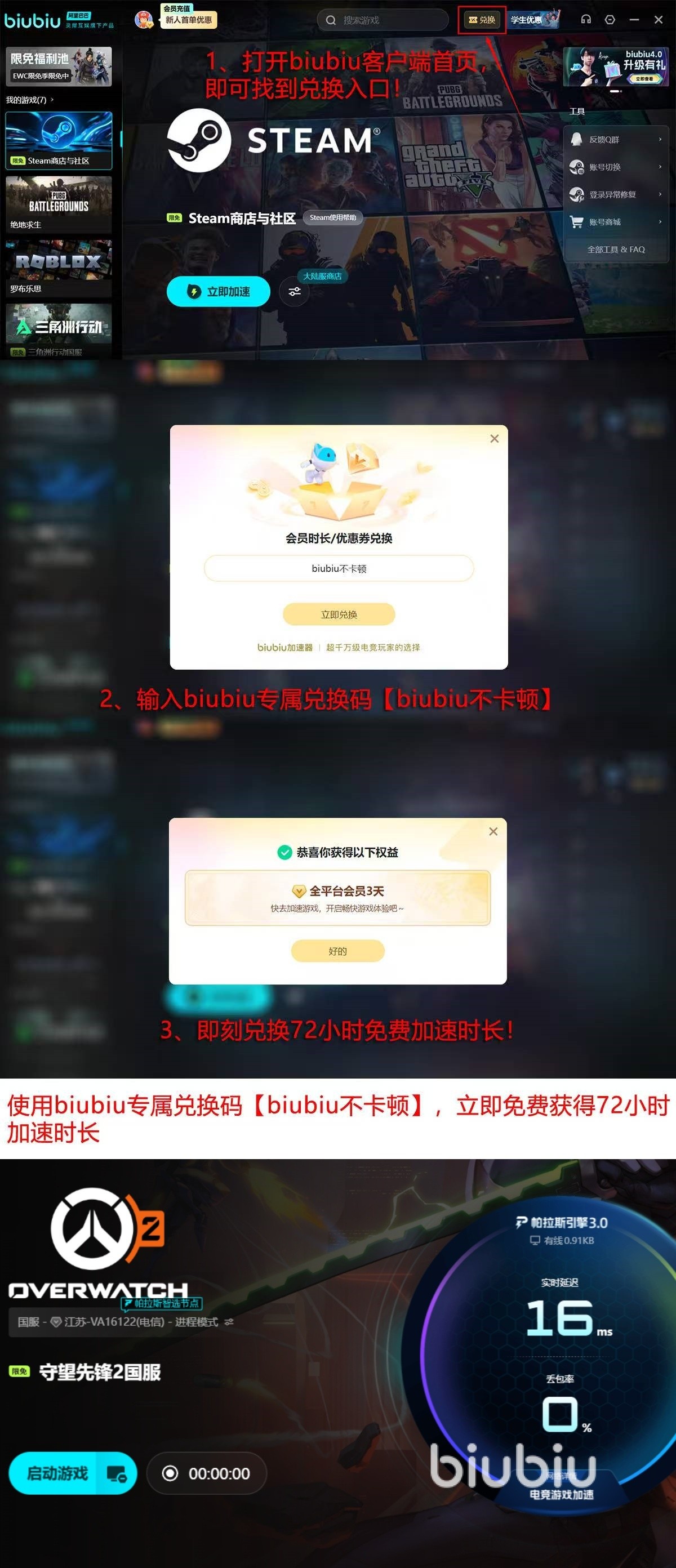 目前面向新用户提供专项体验支持:首次注册即可获赠24小时全游戏免费加速时长;在主界面输入激活口令“biubiu不卡顿”,可额外领取72小时加速权益,两项时长支持叠加使用,总计可连续体验达96小时(即4天)。