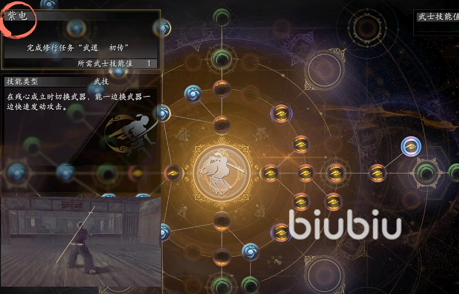 首先就是紫电是一项技能,需要完成特殊的修炼任务才能学习,学习以后观看技能栏,就会发现紫电的触发条件写得很清楚,只有进入残心阶段才可以释放出紫电,否则就是简单的切换武器状态。而这个残心就是一种特殊的状态,玩家们注意看角色身上的颜色,一旦有蓝色光粒出现就代表进入残心。