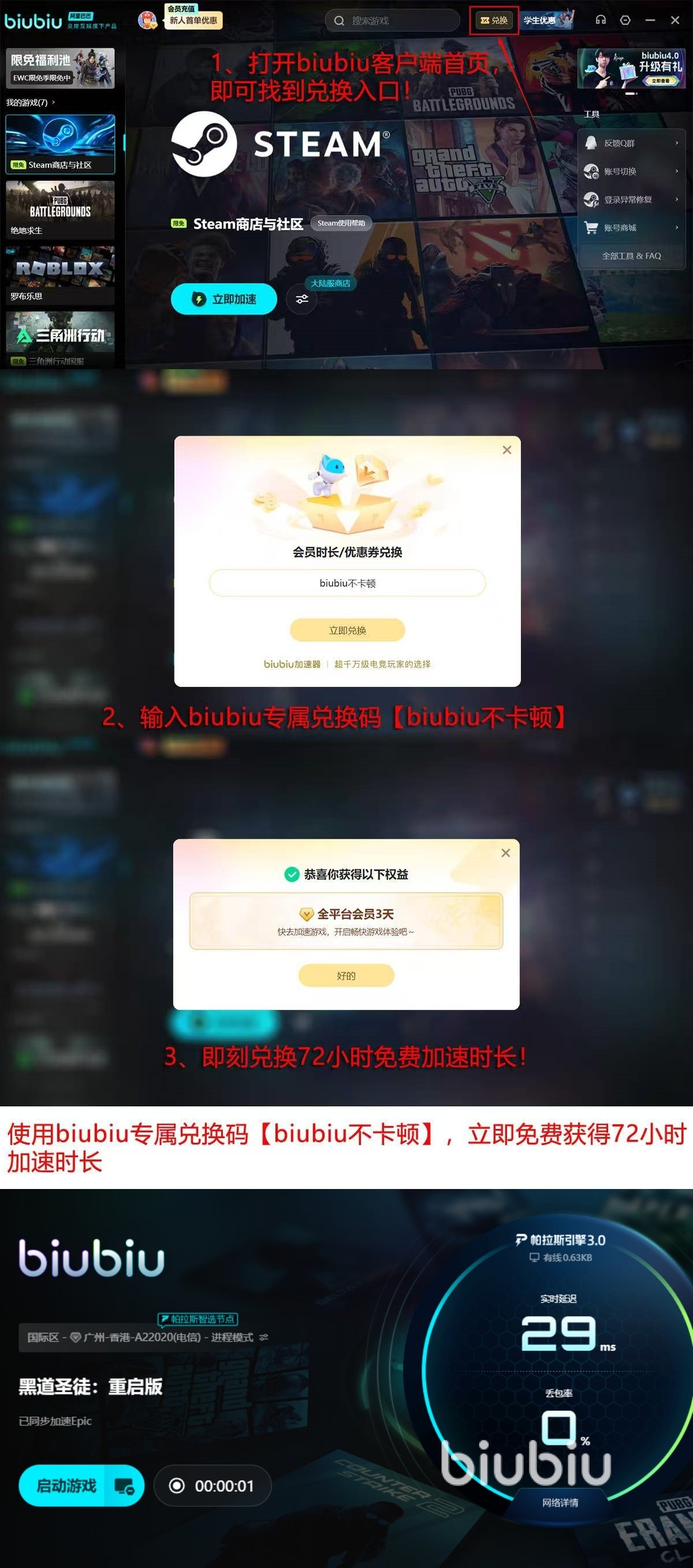 还在犹豫的朋友也不用担忧,现在还有免费体验活动,新用户直接注册账号,就获赠24小时加速服务,“biubiu不卡顿”是有效兑换口令,额外换得72小时会员加速效果,4天时间足够玩家们通过不同游戏来验证加速器带来的效果。