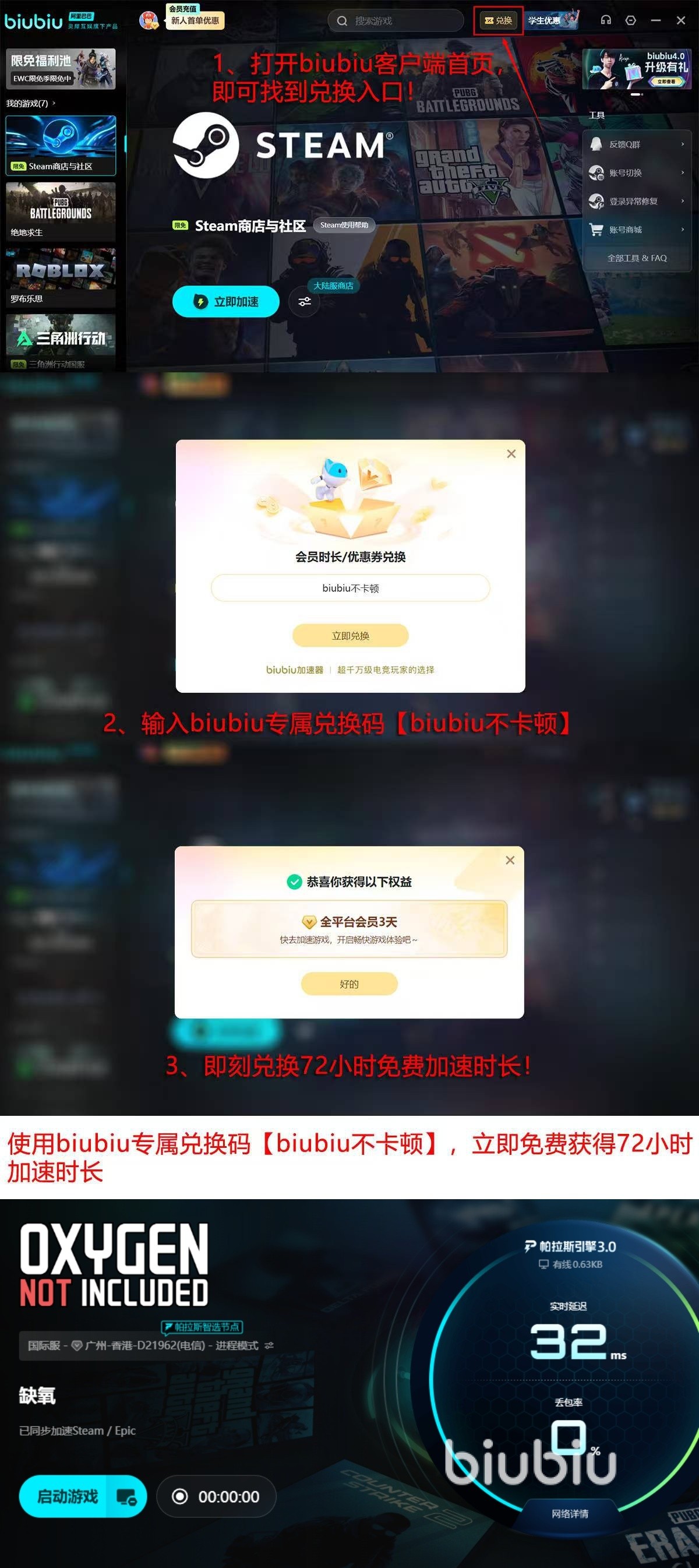 现在还有一个好消息,那就是为了新用户只要完成注册,不需要其他任何附加条件,就能直接拿到24小时的免费加速的时间,用于感受加速优化后的效果,此外用【biubiu不卡顿】这个口令,还能再拿到72小时的免费时长,两者可以相互叠加,让大家直接拿到96小时,从而实际优化效果选择来是否续费。