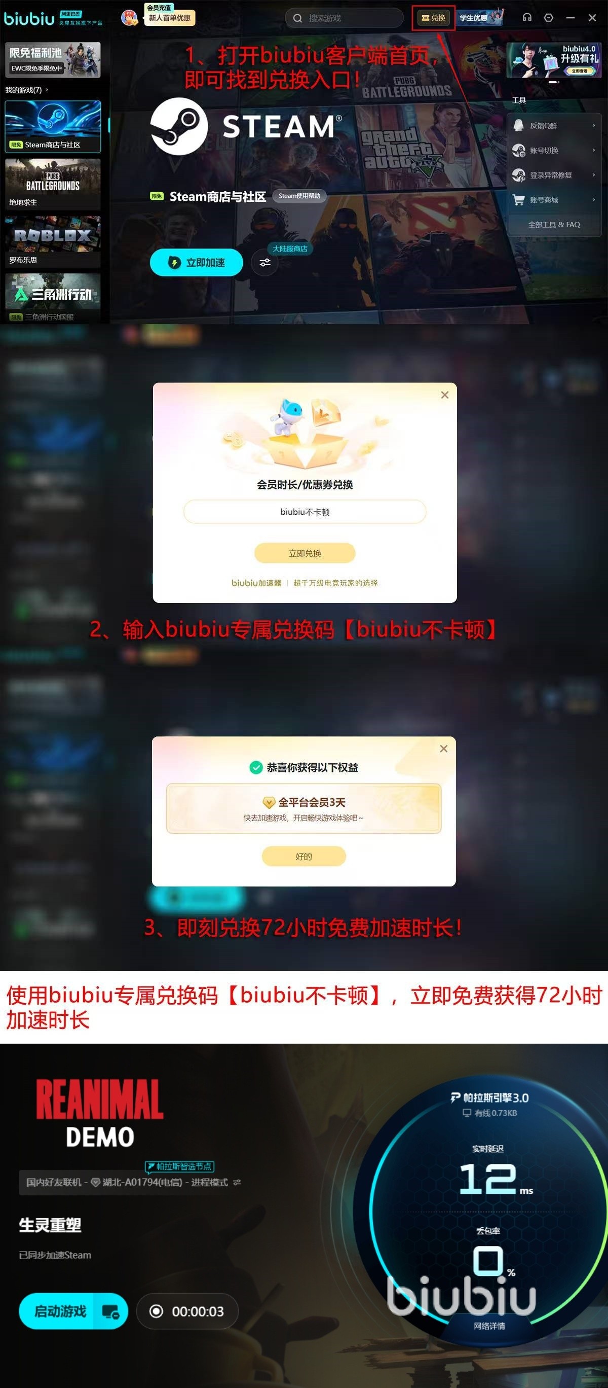 现在用户在第一次登入加速器之后可以享受到24小时的免费加速。如果觉得时间有些不够用的话,那么可以使用兑换码【biubiu不卡顿】,这个能够让我们额外享受到3天的加速时间。