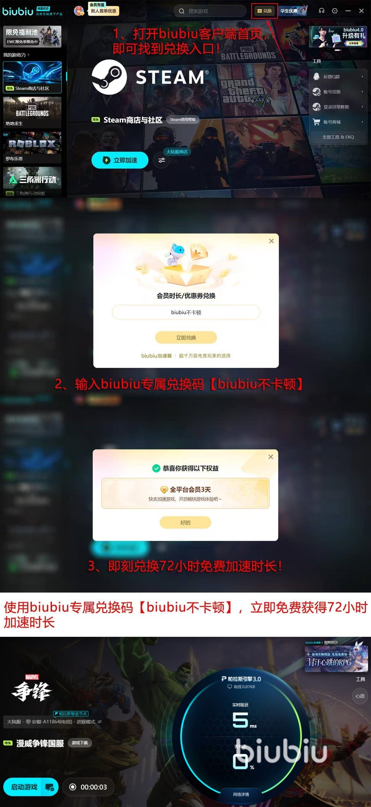 另外除了效果出色外,福利这一块也一样的出色,拥有【biubiu兑换码】兑换72小时免费使用时长的福利活动,和新用户注册免费领取24小时的福利活动,这就意味着同时能满足要求的话是可以白嫖96小时的免费使用时间的,福利力度这一块也没有任何问题,最后除了这些外还可以看到加速器中收录的游戏也很多,可以看到收录了目前市面上能看到的几乎所有的热门游戏,为这些游戏提供加速服务,这意味着不管想要玩什么游戏需要用到加速器的时候,都可以在上面寻找使用,因此才会推荐大家去用这加速器。