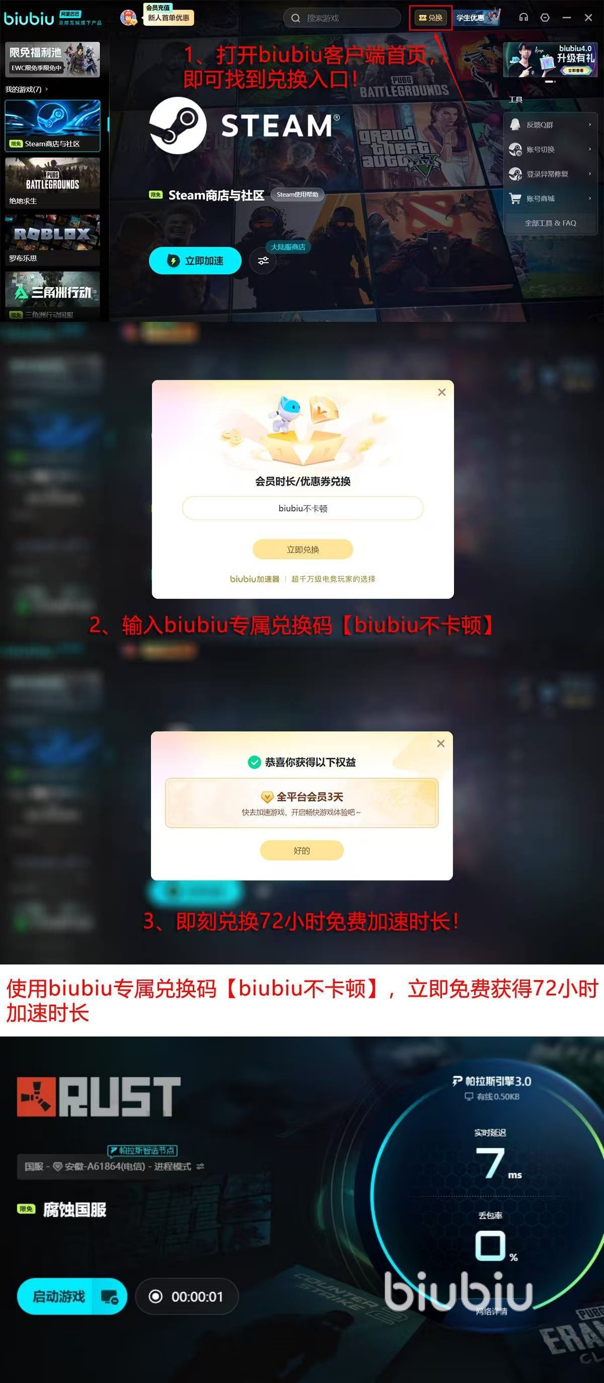 由于rust有激烈的PvP玩法,玩家除了要面对自然环境的挑战,还要提防其他玩家的攻击,这需要良好的网络状态,所以在排除自己电脑以及文件问题后,若进不去大家需要一款好用且专业的加速工具,推荐各位去使用biubiu加速器,它身为综合性能第一名的PC加速器,采用的是帕拉斯引擎3.0,能实时感知网络质量,根据当前各线路延迟来选择最优传输路径,并且它还有绝地求生冠军选手XDD担任体验官,进一步验证了其效果能力,大家使用它,就可以森林、沙漠、山脉和河流等不同环境中探索,利用收集到的资源建造各种建筑武器,或选择和其他玩家组成一个队伍一起协作,或进行对抗直接掠夺对方的资源,在这个没有规则的世界中,持续生存下去。
