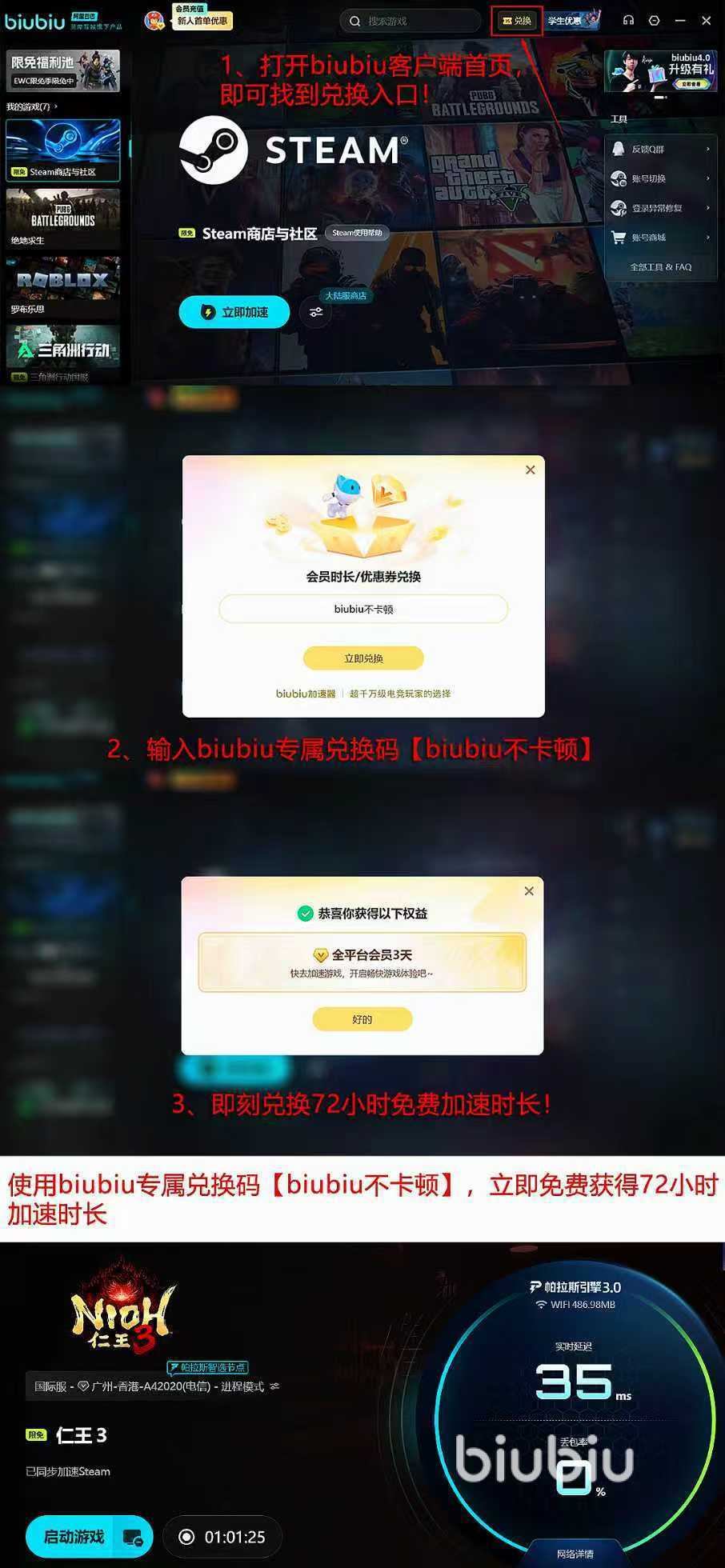 这里还为大家准备了一个小福利,新人注册可以获得24小时的免费使用,新老用户兑换码输入【biubiu不卡顿】即可免费进取72小时免费加速哦。