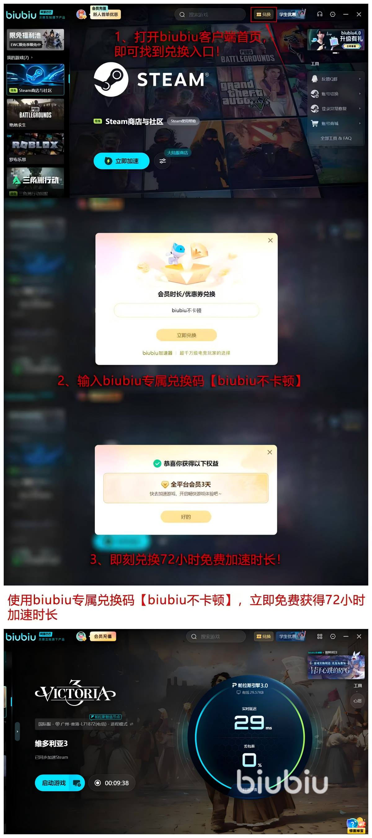 为了能用实际体验证明自己的能力,【biubiu不卡顿】口令非常有用,能够兑换72小时的时间,新用户的24小时也能叠加,总计能获取96小时的时间,对于各位用户来说时间可不短了,有了这个时间的加持,各种热门的作品都能体验,也能逛逛创意工坊添加需要的各种补丁。