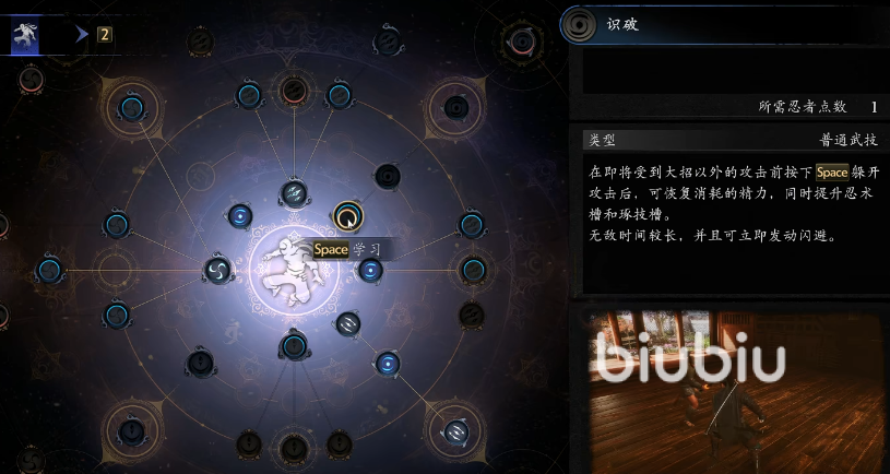 做好了进入游戏的准备接下来就是开启角色的冒险了,首先是解锁各项技能,技能通过各个技能书、指南书来解锁。选忍者的话,最重要就是开“识破”技能,这个技能是忍者的核心爆发技能,可以帮助玩家完美闪避并附带增益效果,可以说是大大提高了玩家获胜概率。另外的技能上可以选择增加防御能力或者是攻击能力的技能。