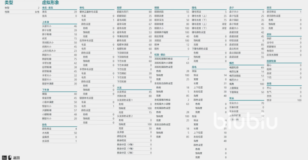 进入游戏之后,体型可以不用变,身材可以按照自己的喜好来调整,重点是面部细节这方面,前额太阳穴调到80,突起度用35,然后眉毛间距控制在30,眉骨深度则是用67,高度可以设置在25左右。仔细观察不知火舞眉毛其实有点挑的,所以眉骨角度设置在53。然后苹果机要提升,厚度在60,颧骨有太不能太突出,高度设定为30。故事中不知火舞年纪并不大,脸腮丰满度还有轮廓都调整到60。下巴也是很重要的一点,下颌骨宽度用8,角度用10,然后下巴长度调到60,毕竟火舞有个尖下巴,丰满度跟位置还有轮廓用0,翘起度调到30就好了。