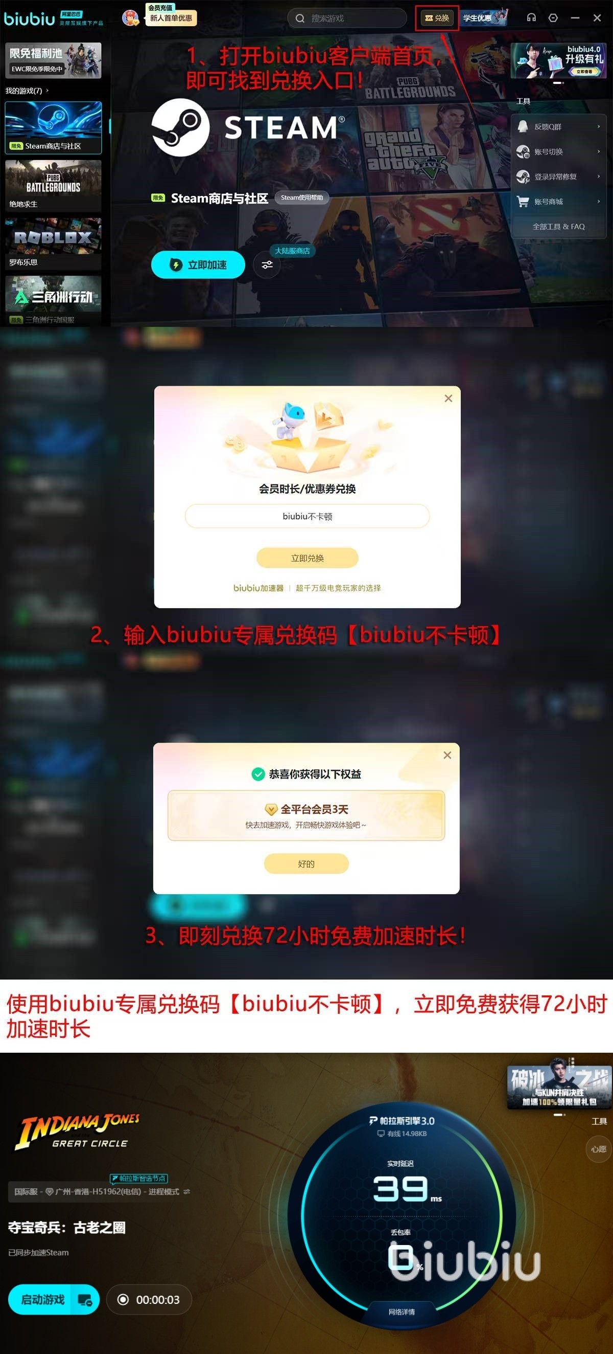 之后除了加速效果好以外,福利方面也是非常好的,只需要在登录加速器后输入【biubiu不卡顿】兑换码那么可以领取到72小时的免费加速器时长,另外如果是新用户的话那么还可以再领取24小时的免费加速时长,总计就是96小时的免费使用时间,但凡用过加速器的玩家就应该明白这免费使用的时长到底有多夸张了吧,可以说就福利内容来看也是所有加速器中最好的了,也正是因为福利好、效果好、游戏多才会推荐大家去使用这款加速器。