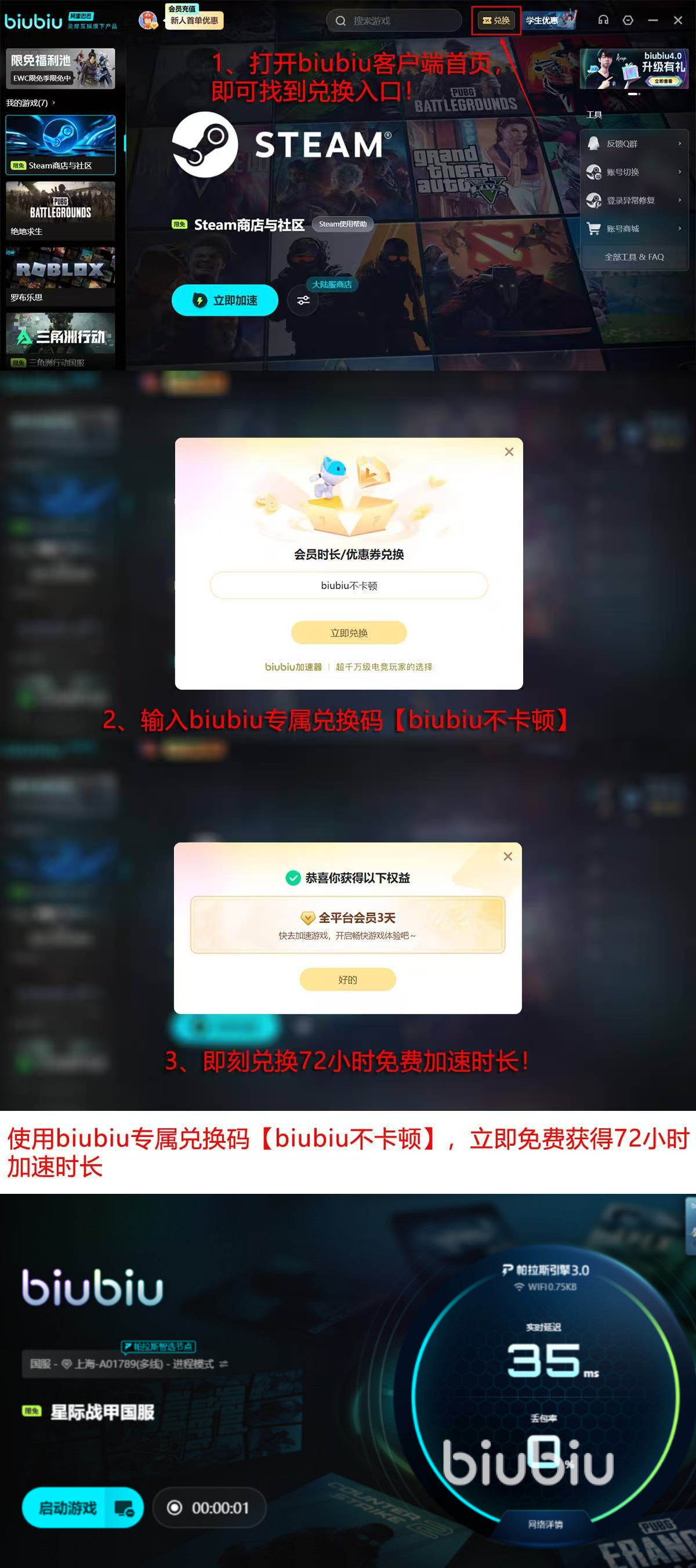为了使新用户能够无负担地体验到它的强大性能,biubiu给出了诚意满满的入门福利,成功注册之后即可激活首日24小时全功能免费试用,输入【biubiu不掉线】继续流畅宇宙探索72小时。双福利叠加,新人可以享受总计4天的顶级游戏加速体验。