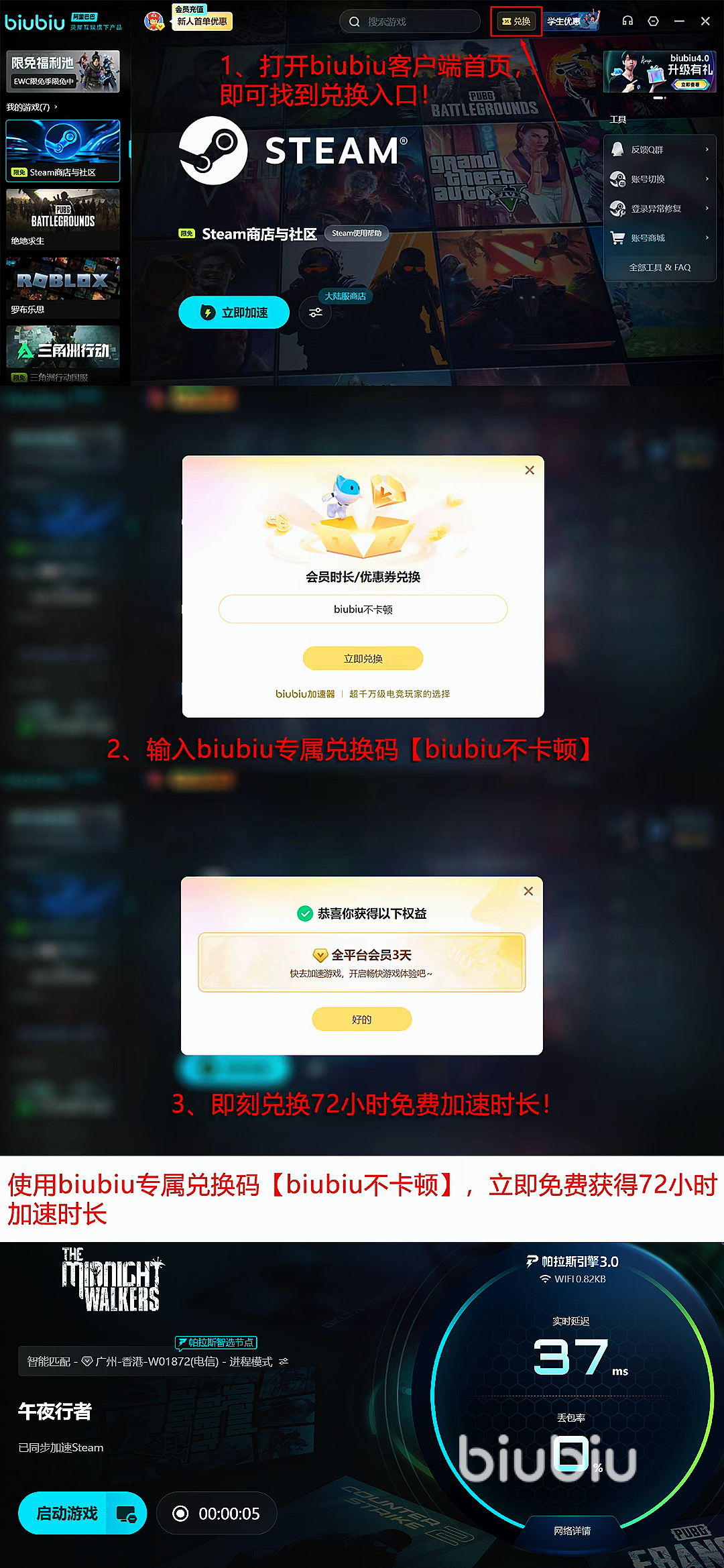 在加速性能优化的同时,biubiu的福利方面自然也是不会吝啬的,新用户完成注册以后便可直接领取24小时全场游戏免费加速,所有用户只需输入兑换码【biubiu不卡顿】,就能额外再领取3天免费加速时长,加速效果非常出色。
