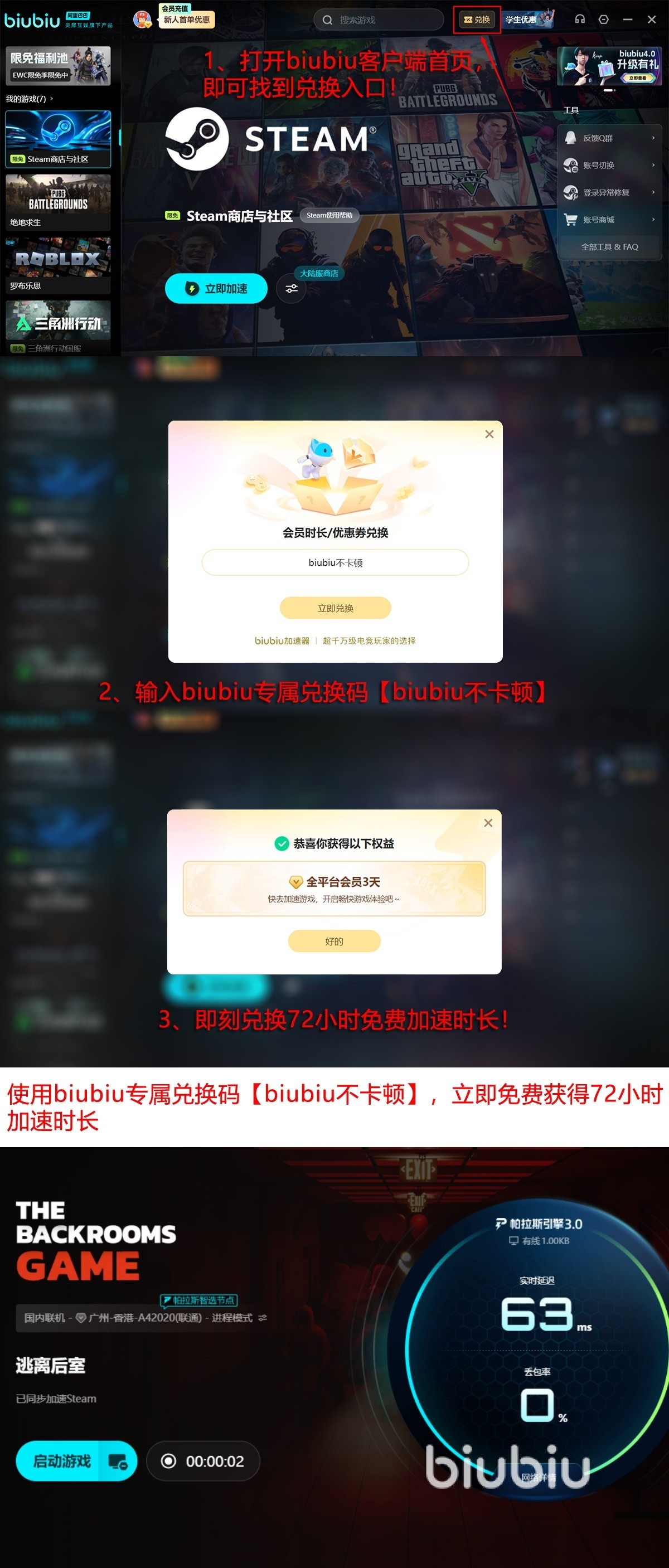 另外对于玩家们,biubiu也是给予了超多的福利支持,新用户的话首次注册之后能免费获得24小时的加速时长,另外所有的玩家只需要输入正确的口令【biubiu不卡顿】也是能得到免费3天的加速时间,叠加在一起相当于用户们可以拥有96小时免费加注机会,在此期间,所有热门、小众游戏,大家都可以同步加速。