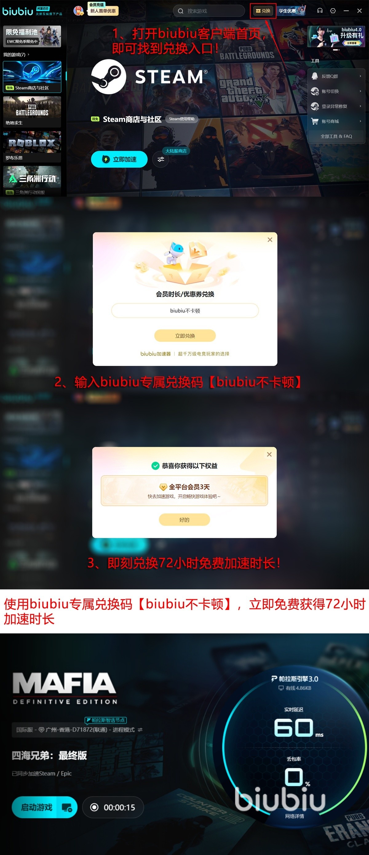 除了加速效果给力之外,biubiu的福利也是很多的,首次注册是能够直接获取24小时的免费使用权限,在此期间大家可以一键加速更多热门游戏,手游、端游还有一些switch游戏都是可以的,另外,如果大家觉得24小时时间过短,同步输入兑换口令【biubiu不卡顿】还能轻松获得3天免费加速机会,如果是首次使用的话,叠加在一起最多可拥有96小时免费体验时长,给了大家更充足的时间去确保平台的使用价值,再决定后续是否继续使用。