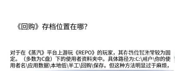 2026年02月07日 08:52 来源:小速在《REPO》这款后启示录风格的生存游戏中,人类文明已然消逝,而玩家将操控一台外形酷似垃圾桶的机械生命体,在阴森破败的废墟中穿梭探索。游戏以高难度著称——角色一旦死亡,所有已收集物资将永久丢失,无法恢复。因此,掌握存档机制成为通关的关键前提。若不清楚REPO的本地存档路径,可能导致关卡进度中断,前功尽弃。以下将清晰说明官方存档位置及安全备份方法。