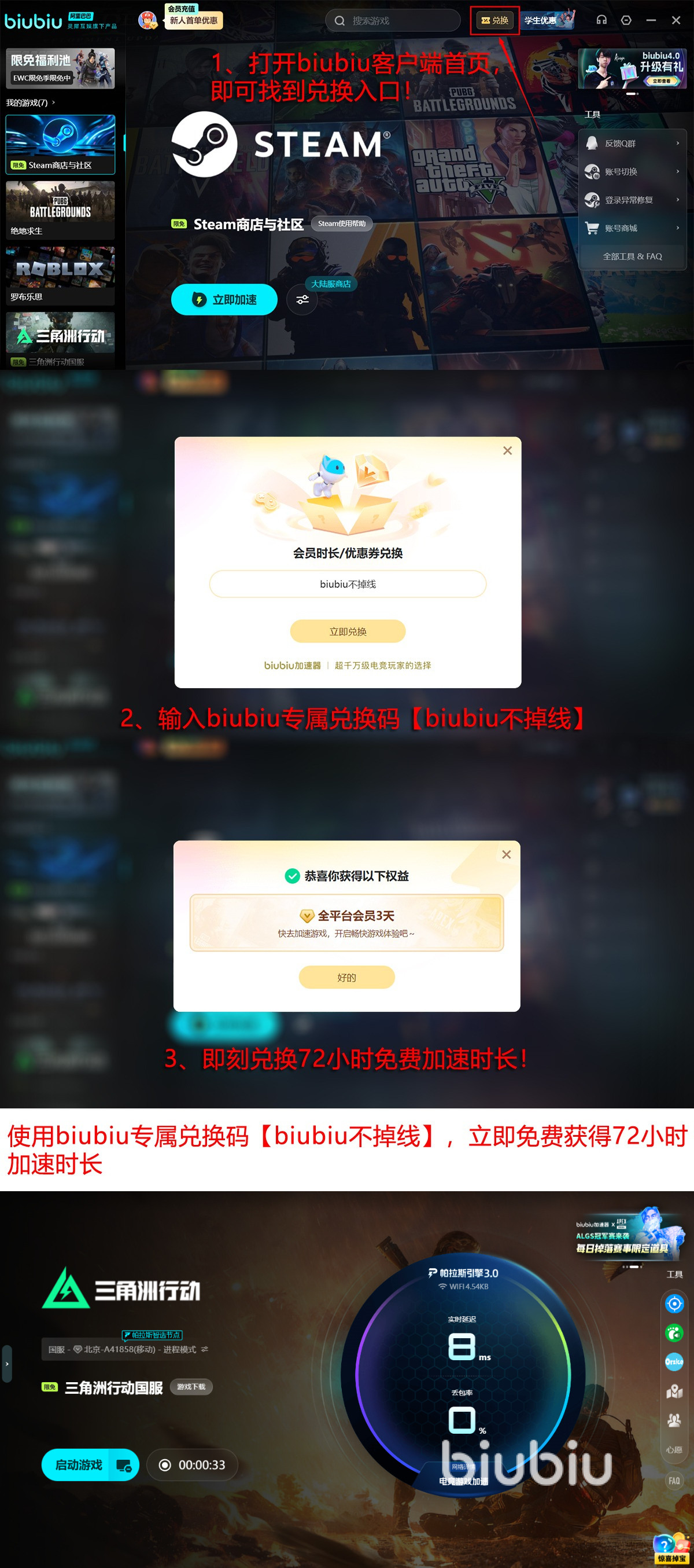 新用户注册后即可激活24小时全功能免费试用权限;输入专属口令【biubiu不掉线】还可额外获得开启流畅极速联机体验资格,享72小时定向加速服务。两项权益叠加,首日最高可累计使用96小时专业级网络优化支持。