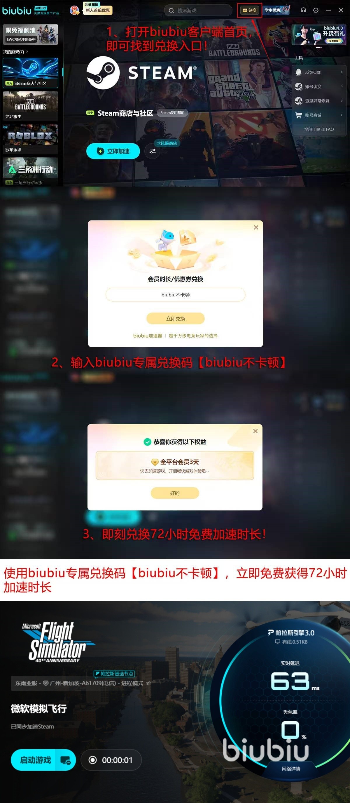 目前,新用户完成注册后即可立即启用24小时全功能免费加速服务。此外平台同步开放限时福利活动:输入兑换码【biubiu不卡顿】,可额外领取3天高级加速时长,无需付费即可深度体验全部优化能力。