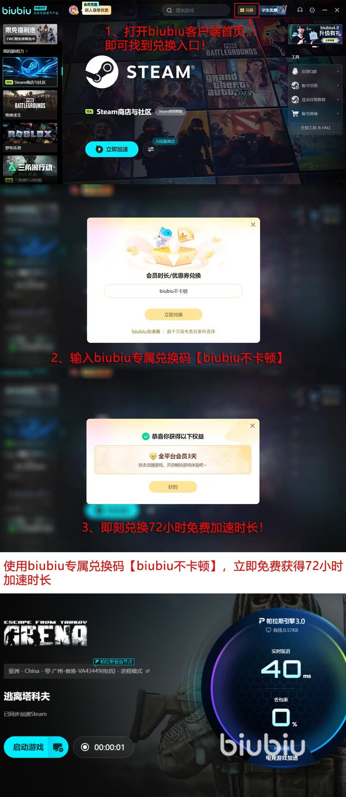 目前,biubiu加速器面向新用户提供24小时全功能免费试用权限。若需延长体验周期,可输入兑换码【biubiu不卡顿】,额外获得3天高级加速服务,覆盖《逃离塔科夫》全服区及多平台联机场景。