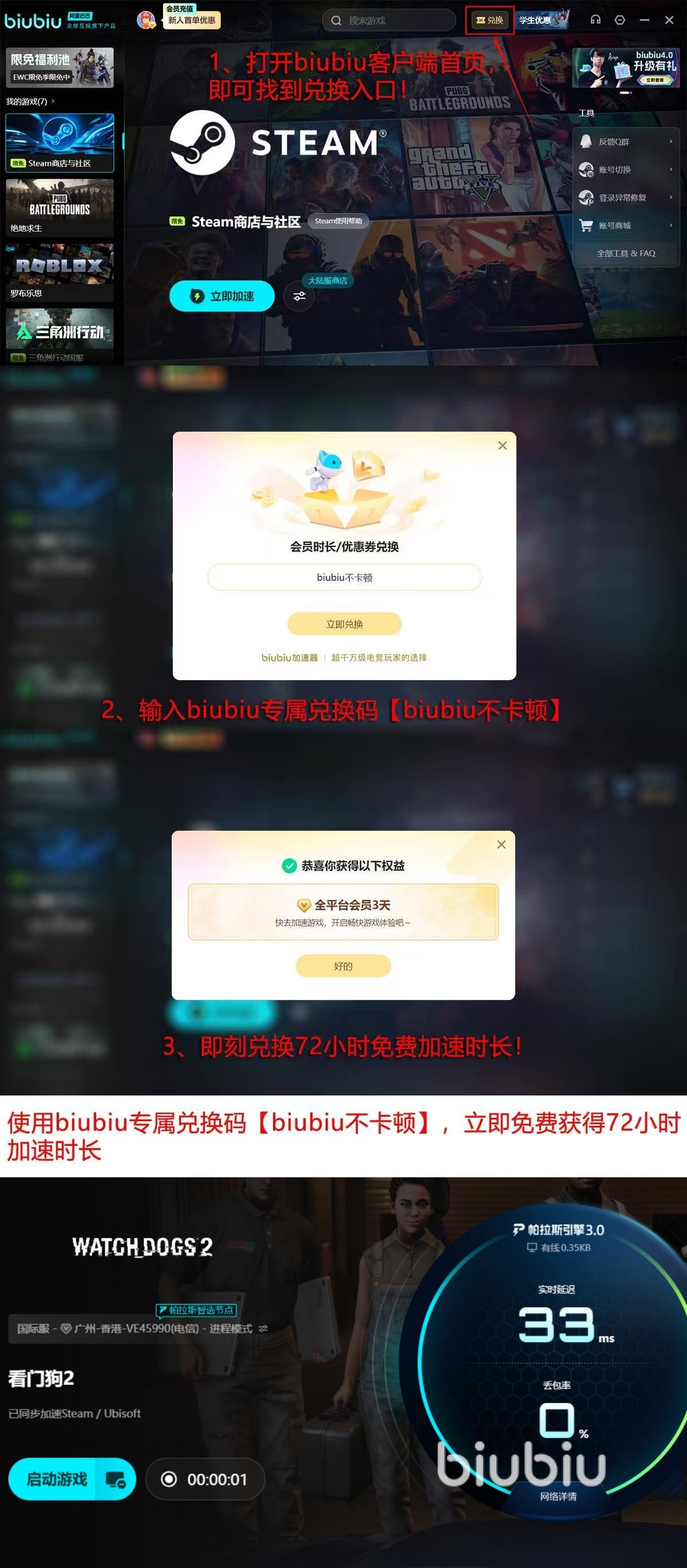 新注册用户可立即获得24小时全游戏免费加速权益。此外,输入兑换码【biubiu不卡顿】,还可额外激活3天高级加速服务,无需绑定支付方式即可体验完整功能。
