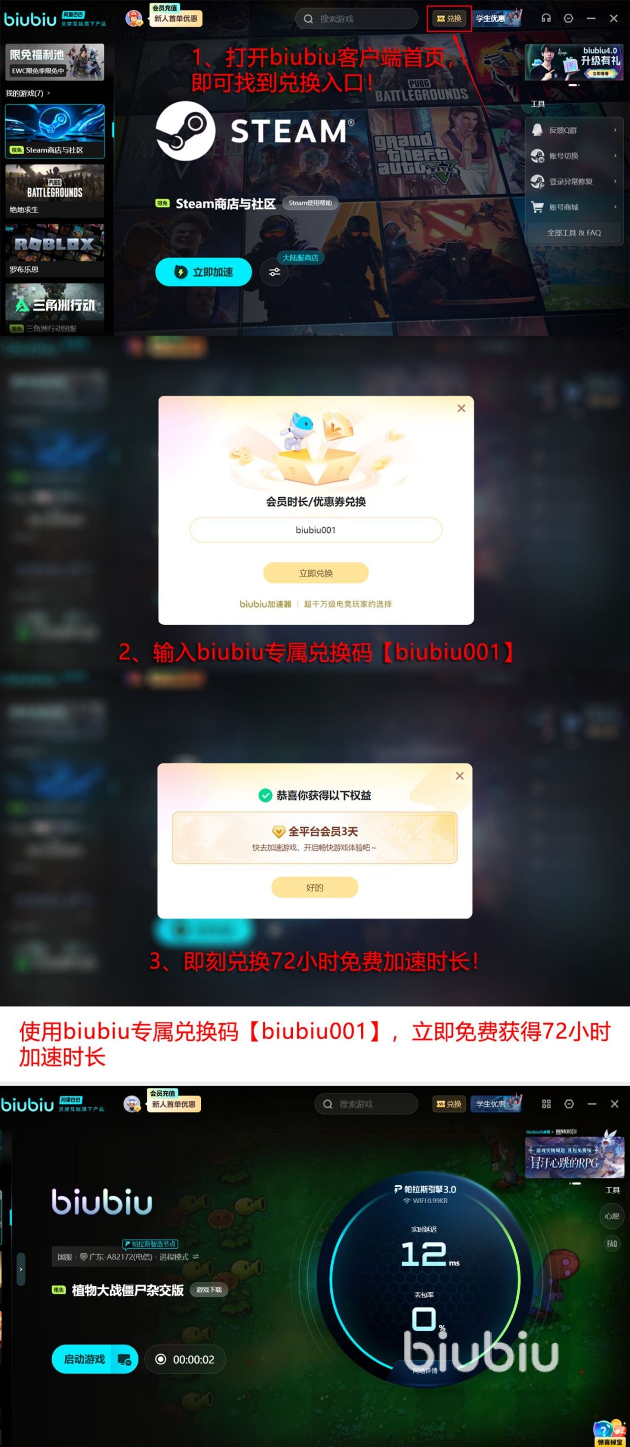 当前新用户注册即可获赠24小时免费加速时长;输入兑换码【biubiu001】还可额外解锁三天加速权益。两项福利叠加后,新用户总计享有96小时免付费加速体验,零门槛开启稳定流畅的杂交版冒险之旅。