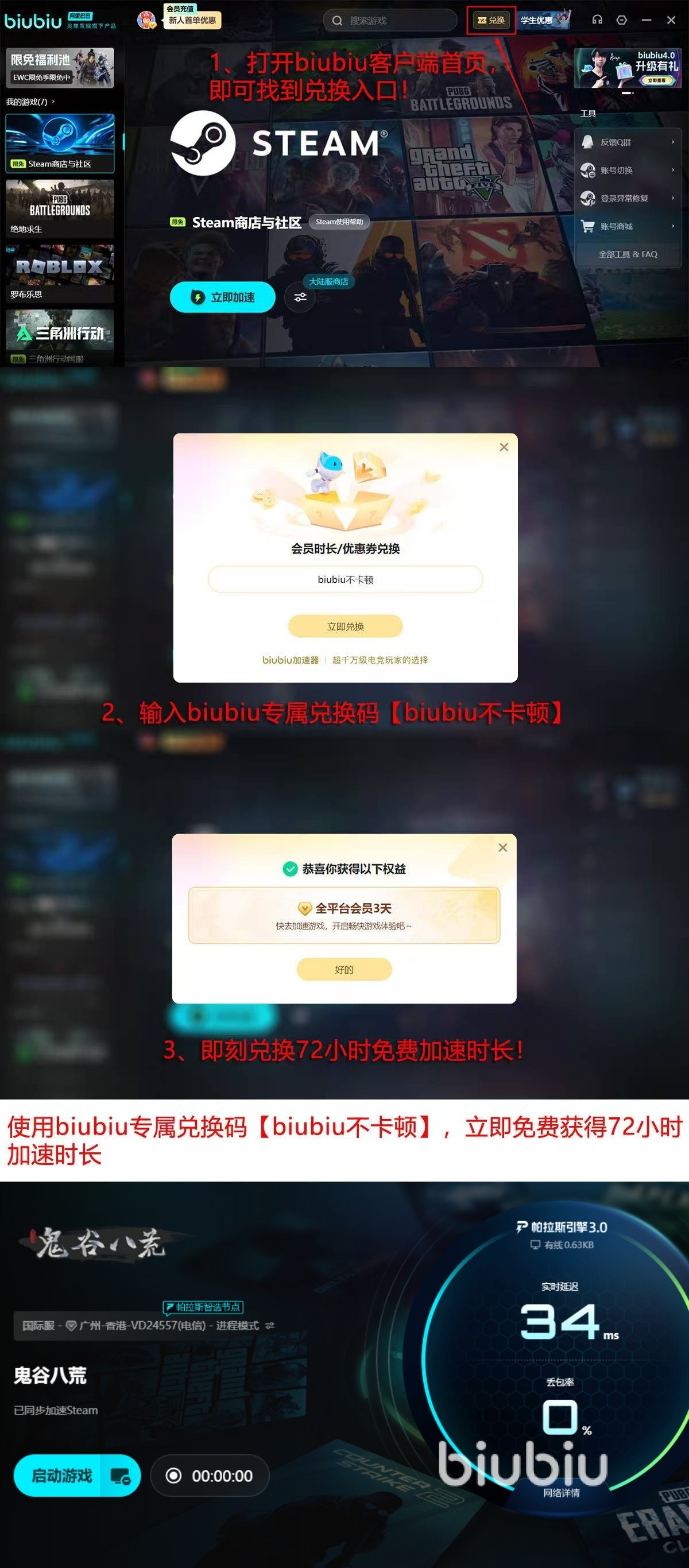 目前新用户注册并完成首次登录,即可立即获得24小时全游戏通用免费加速时长;输入专属口令【biubiu不卡顿】,还可额外激活72小时服务权限,累计享96小时无限制加速体验。